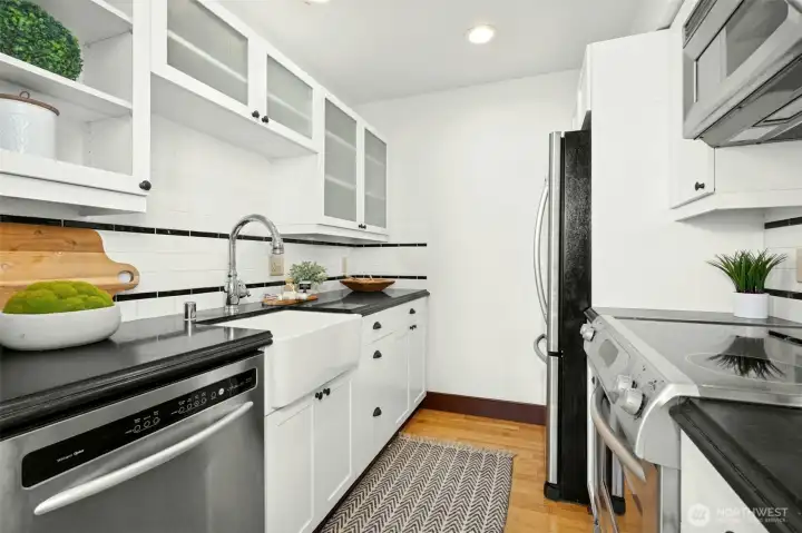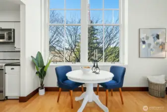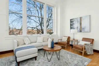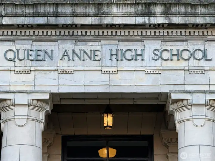 Experience living in the historic Queen Anne High School Condominiums, located in the heart of iconic Queen Anne. This desirable corner unit features oversized windows on two walls & dramatic 14-foot ceilings, creating an airy, light-filled living space. Hardwood floors & a freshly painted interior enhance this true one-bedroom condo—not a loft or studio. The building’s Art Deco architecture & character make it a truly special place to call home, with charming historical touches throughout, including original chalkboards in the 4th-floor lobby, framed yearbook covers in the hallways, & a curated museum on the 2nd floor. The efficient kitchen offers a farm-style sink, subway tile backsplash, glass-front cabinets, & stainless-steel appliances. Enjoy access to a rooftop deck with sweeping views of the city, Space Needle, Puget Sound, & surrounding mountains. Add'l amenities include a dedicated covered parking space, secured entrances, in-unit washer/dryer hookups plus free laundry rooms on every floor, on-site management, a package delivery room, pet-friendly policies, & NO rental cap. Ideally located near shops, dining, coffee, transit, and all that Seattle has to offer. No special assessment for this unit. Resale certificate available. Scaffolding currently in place to complete masonry project.