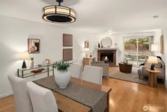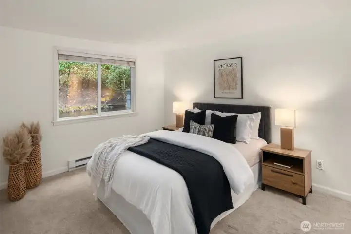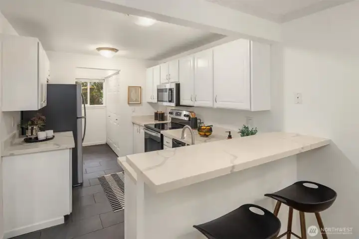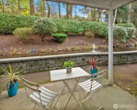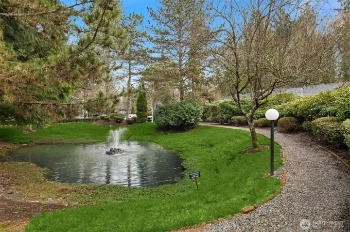 Tucked into the peaceful, well-maintained Kirkland Springs community, this updated ground-floor unit offers 980 square feet of comfortable, easy living. With a private exterior entrance and no common hallways, access is both convenient and welcoming. The ideal floor plan lives large, featuring an open layout with a dedicated dining area, a cozy wood-burning fireplace, and two generously sized bedrooms. The living space opens to a serene outdoor retreat with a private patio overlooking a tranquil pond and fountain. Recent upgrades include fresh interior paint, new tile flooring in the entry, kitchen, and bathrooms, marble kitchen countertops, and brand-new appliances including a refrigerator, dishwasher, and range. Both bathrooms have been refreshed with new tile flooring and countertops for an upgraded modern look. This unit checks all the boxes on your condo list with an assigned covered parking space plus additional owner and guest parking, in-unit laundry, and amenities including a clubhouse, pool, hot tub, fitness room, and basketball court. Located just a short stroll or roll to shopping and dining at Juanita Village and Juanita Beach Park, and minutes to The Village at Totem Lake and downtown Kirkland's lively waterfront. Convenient to I-405 for easy access to downtown Bellevue, Google Kirkland, and Microsoft. No rental cap, no special assessments, and located in the award winning Lake Washington School District.