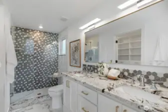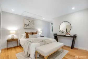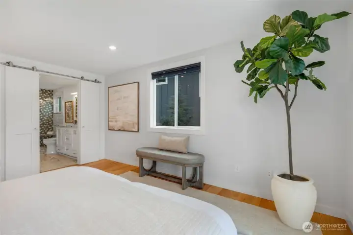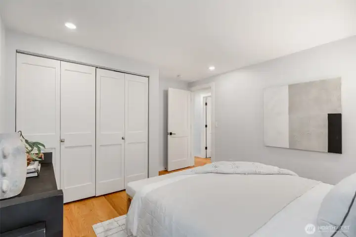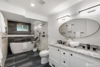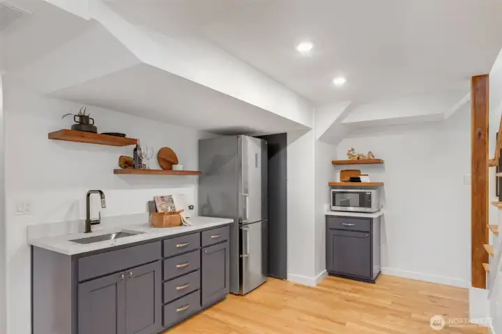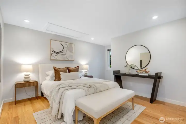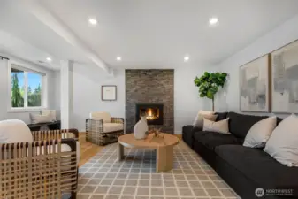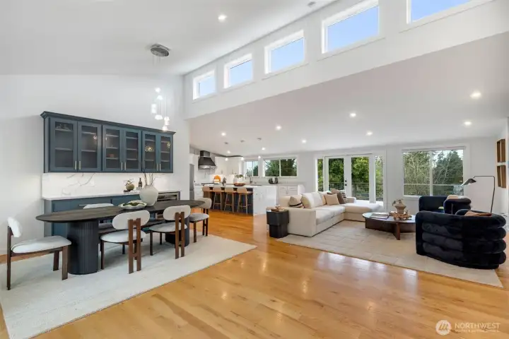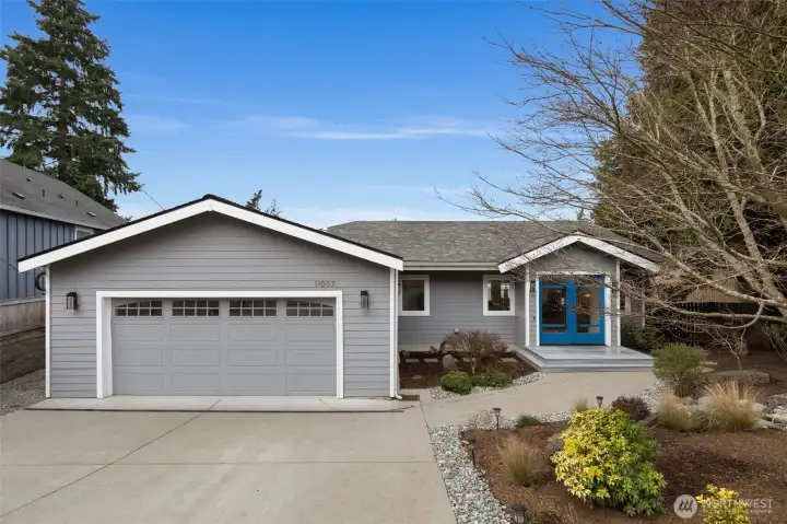 Thoughtfully redesigned North Rose Hill home rebuilt to the studs in 2020 and designed for elevated living. An expansive open-concept main floor showcases soaring vaulted ceilings, transom windows and a striking granite-slab gas fireplace. The kitchen is both refined and functional with a double waterfall quartz island, Bertazzoni appliances & custom cabinetry, flowing seamlessly into the dining area with built-in buffet & wine fridge. French doors lead to an impressive 760 sqft deck overlooking a private, garden-like backyard with mature fruit trees. 2 bedrooms on the main include a tranquil primary suite with deck access, blackout shades and a spa-inspired bath. The lower level features a kitchenette, rec room with fireplace, 2 additional bedrooms, a full bath & patio access. Hardwood floors, solar panels, 2 car garage with EV charger, CAT5 wiring and plumbed for a gas generator.