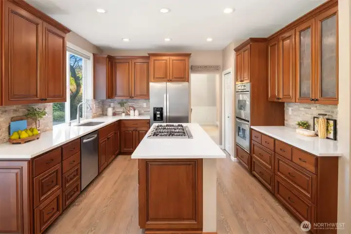 Welcome to this beautifully presented home in the sought-after Stonegate community of Renton Highlands. Situated on a generous corner lot, this residence offers exceptional privacy, space, and tranquility in a small upscale neighborhood known for manicured homes and pride of ownership. The expansive backyard is a true retreat, featuring a serene water feature, lush landscaping, and a spacious patio, perfect for summer BBQs, gatherings, or quiet evenings surrounded by nature. Enjoy peaceful views of Cougar Mtn and the feeling of privacy on all sides. Inside, the home showcases an open floor plan that flows effortlessly, designed for both everyday living and entertaining. A private dining room off the kitchen creates the ideal setting for hosting dinner parties and special occasions, while two fireplaces add warmth and a cozy, inviting atmosphere throughout the home. The primary suite is generously sized, featuring a spa-like bathroom and a thoughtfully designed custom closet system. Fourth bedroom can be a bonus room, while a dedicated main-level office provides an ideal work-from-home environment. The kitchen is both functional and welcoming, featuring stainless steel appliances, ample storage, and a dedicated pantry. The three-car garage includes an electric vehicle charging station, and the home is pre-wired for a generator, offering added peace of mind and future-ready convenience. Located in the Issaquah SD. Just minutes to trails and shopping.