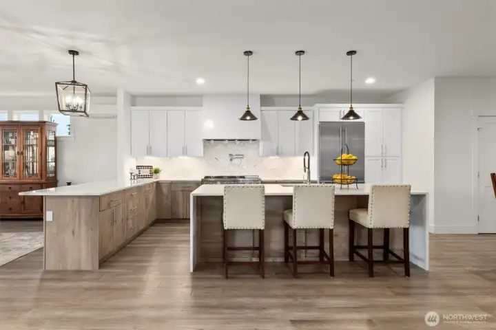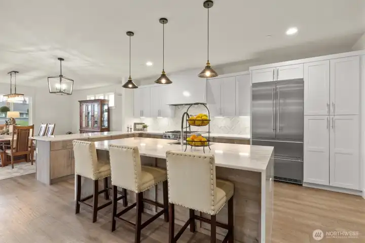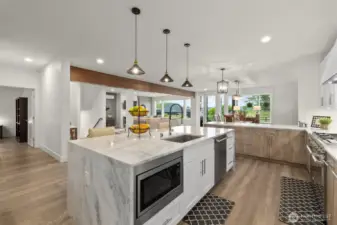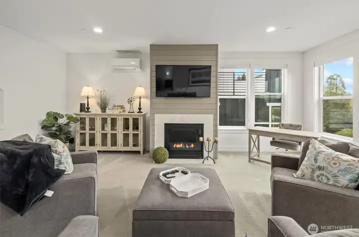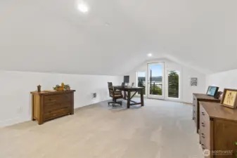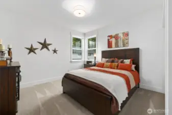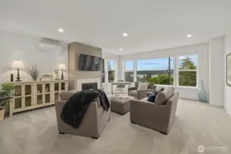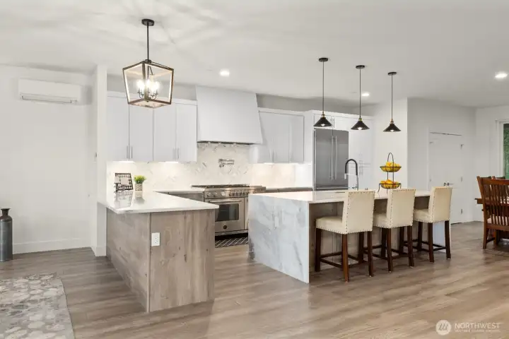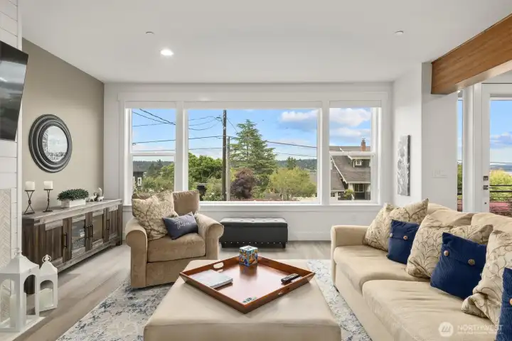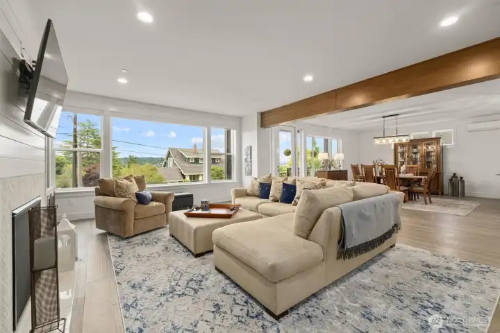 Contemporary farmhouse in desirable Seward Park w/views of Lake Washington & Mt Rainier. Open concept layout on the main floor features dining room, living room, & kitchen creating a perfect flow for everyday living & entertaining. Chef's kitchen equipped with 48" Bertazzoni gas cooktop & range, marble countertops & backsplash, large island w/sink, & a walk-in pantry. Cozy up by one of two fireplaces, & enjoy NW summers under the covered veranda plumbed for gas grill & large fenced yard. Upper floor features second living area, primary suite w/luxurious spa-like bath & walk-in closet & two bedrooms. Third-floor flex room w/wet bar, Juliet balcony, with east facing views. Large 1Bd/1Bth ADU on ground floor w/separate utilities & laundry. Perfect for generational living or rental. Mini-split heating/cooling. Large finished bonus rm on ground floor. Whole house fire sprinkler system.