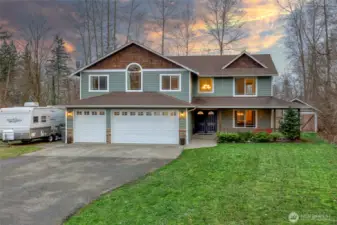 Set on a full, level acre backing to peaceful woods, this beautifully maintained Craftsman offers the perfect blend of privacy, space & everyday luxury. A welcoming covered front porch captures northwest sunsets, while vaulted ceilings & abundant natural light create an inviting first impression. The thoughtfully designed main level features formal living room & dining room, a comfortable family room & a kitchen positioned at the heart of the home, ideal for both daily living & entertaining. The updated kitchen showcases quartz countertops, stainless steel appliances, classic subway tile backsplash & easy access to the backyard patio for seamless indoor-outdoor gatherings. An oversized 3-car garage with room for a workshop, while a main-level powder room adds functionality. Upstairs, the expansive primary suite offers vaulted ceilings, a walk-in closet & a spa-like 5-piece bath with a multi-head walk-in shower designed for relaxation. Three additional bedrooms, a full bath & a generous bonus room provide flexible space for guests, work or play. Outdoors, enjoy a wide open acre with room to roam, a large outbuilding for tools or toys & RV parking with power & water hookups. Located just minutes from shopping, everyday amenities & quick freeway access, this property delivers serene country living without sacrificing convenience.