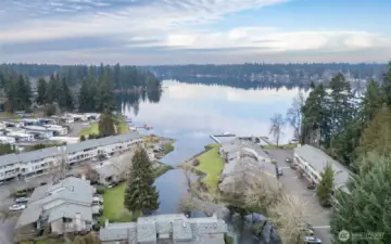 Gated Lake Front Luxury Condo! This is a RARE opportunity to own Condo that sits right on Coffee Creek. These Townhouse Style Condos enjoy creek & lake views + access to the lake via private boat launch, docks for mooring watercraft & a private club house to enjoy to host your larger gatherings.The prior owner had a Complete Custom Remodel in 2018. The Kitchen is amazing; Natural Gas Cooktop/Oven, w/ water spigot for filling pots. The Bathrooms are tiled & have glass surrounds/doors. The current owner installed a grand roof structure over the deck in 2025 [$7,300] to enjoy the large deck, while being sheltered from the weather, while gazing at Coffee Creek as it flows into Spanaway Lake. They also replaced all lighting with Custom Fixtures from the Glass Candle! This condo has a wonderful layout that is open & bright, with beautiful large windows to look out at the creek from your kitchen & great room. Remote Controlled Natural Gas Insert (Fireplace). Private garage with remote controlled opener. Community amenities are incredible; enjoy the exclusive luxurious community features; now bank lake access, docs for mooring boats, sport courts (PickleBall/Tennis/Basketball), 2 picnic areas, Heated Outdoor Swimming Pool, Walking Trails w/ 3 Bridges, RV & Watercraft Storage Space. Conveniently located for commuting, shopping, dining, schools, Sprinker Recreation Center, Spanaway Lake Golf Course & just minutes to JBLM. This home offers the perfect balance of comfort and convenience.
