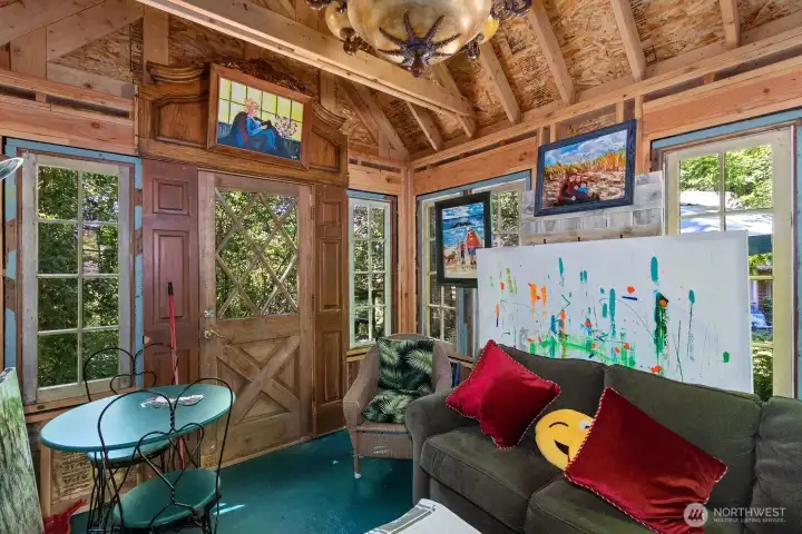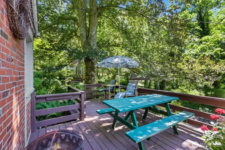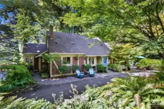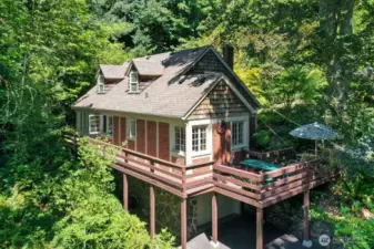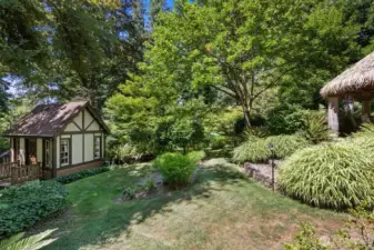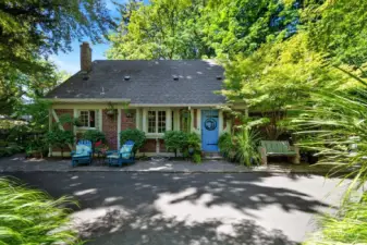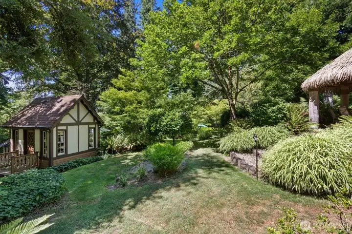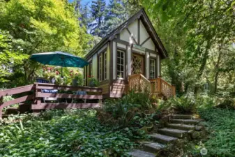 Nestled on a pristine one-acre + secluded park-like setting, this charming 1940s bungalow combines timeless tradition with modern updates. Featuring three bedrooms, two baths, beautiful hardwood floors, and thoughtful renovations throughout, it also boasts many built-ins, original character details making you feel like you have stepped back in time, a delightful tiki bar, a creative art studio, and multiple outbuildings, outdoor fireplace, decking that surrounds the home to take in the stunning views, listen to the seasonal creek while enjoying your outdoor jacuzzi. This stunning home perfectly blends character and convenience. Room for a shop too! Assumable loan at 2.265%