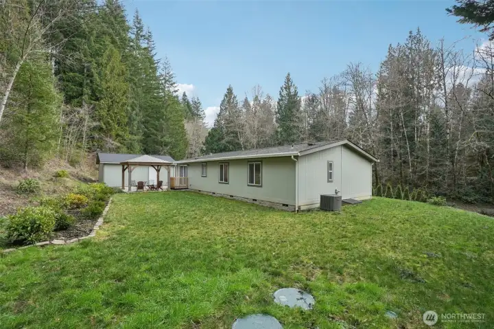 Gorgeous 2022 Skyline home on over 1/2 an acre surrounded by trees for added privacy PLUS a 2024 built detached 2 car garage. This Open Concept home features an open kitchen, Quartz Counter tops, SS Appliances & modern finishes. The Owners' suite, opposite the additional 2 bedrooms, is large and private. Enjoy all the creature comforts with an outdoor living space & surrounding nature.