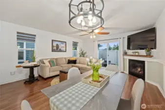Well-maintained 3-bedroom, 2.5-bath home offering 1,413 sq ft of comfortable living space with fresh paint and new carpet throughout. Interior features include a cozy gas fireplace, gas furnace, and a mix of carpet, vinyl, and laminate flooring. The bright kitchen showcases white cabinets, quartz countertops, and a full appliance package including gas oven/range, microwave, dishwasher, refrigerator, and garbage disposal. Enjoy outdoor living with a 12x12 stamped concrete patio, fully enclosed vinyl fencing, and a private gate providing direct access and views of Jensen Park. Attached 1-car garage includes built-in shelving for added storage. Built in 2006 with wood siding, shake/shingle roof, and crawlspace foundation. HOA dues of $349/month cover garbage, exterior maintenance, landscaping, grounds upkeep, and building repairs. Buyer responsible for interior insurance and contents. Convenient, low-maintenance living in a great location.