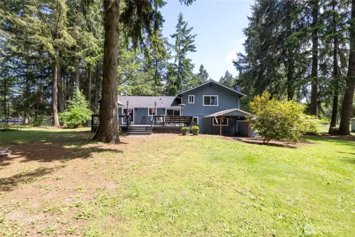 Set on over 2 acres of fenced, level land, this well-maintained 4-bedroom, 3-bath 2002 sq ft home offers space, versatility, & features rarely found together: 3-stall barn, large, detached garage/shop with bonus room, extensive parking, and a convenient 10-15 minute commute to JBLM. The main level features a remodeled kitchen with abundant storage & counter space (TV stays), a spacious living room with fireplace, and a dining area with French doors opening to a large composite deck with covered BBQ area, perfect for entertaining. Downstairs includes a cozy bonus room with pellet stove and a full laundry room with half bath and separate exterior access without stairs, ideal for multi-generational living or guests. Upstairs you’ll find a generous primary suite with walk-in closet & full bath, plus 3 additional bedrooms and another full bath. Recent updates include a newer roof, windows, all new interior paint in 2024 (including ceilings), replaced garage door openers on attached garage, all new gutters on the barn and portions of the shop. All appliances stay, along with a Nest security system and propane-powered generator. Outside, enjoy fenced garden beds, fruit trees, a poultry coop with automatic door, treehouse, detached shop with 220 power and room to truly spread out. Too many perks to list, this is one you must see! Don’t miss the virtual tour!