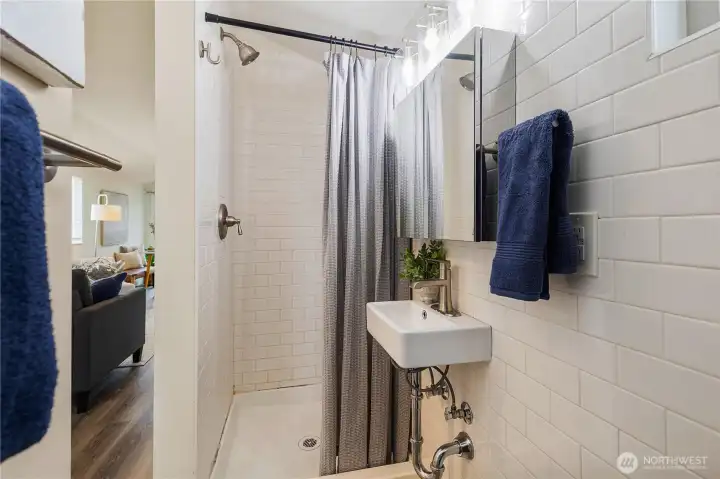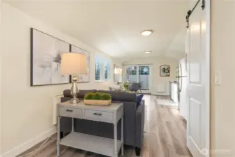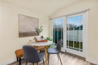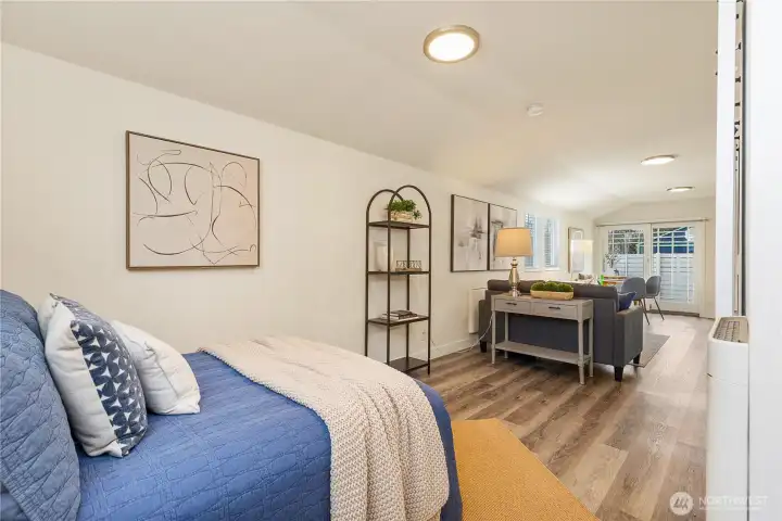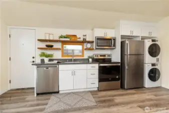 This charming, detached home offers an impressive blend of character and functionality. The open, studio-style layout features a kitchen w white shaker cabinetry, floating shelves, gray quartz countertops, an undermount sink, and stainless-steel appliances including a range and micro hood. Windows feature blinds and fill the space with natural light with east facing windows capturing Cascade mountain views. Sliding barn doors for built in shelving storage and for full bath with floor-to-ceiling subway tile, a pedestal sink, and a medicine cabinet. Stackable washer and dryer. Step outside through the slider to private, fenced yard w SW exposure —perfect for enjoying the sun. The home also includes designated off-street parking. Prime location, just minutes to Watercrest Park and easy access to downtown Seattle, Burien, and West Seattle.