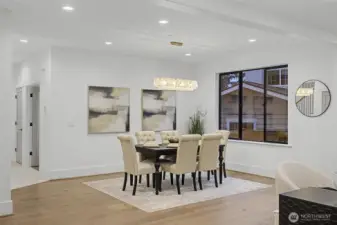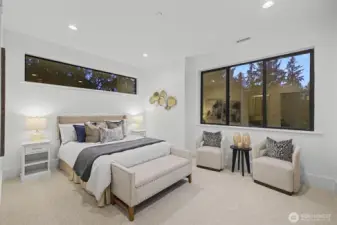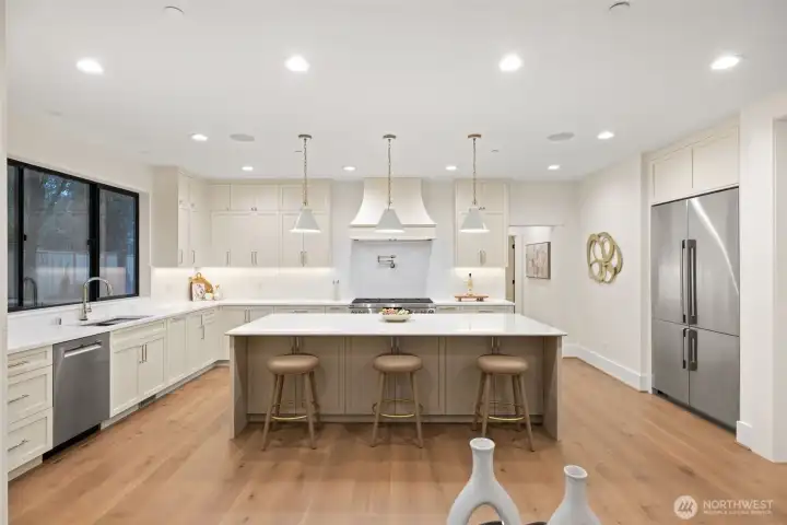 Level Up Custom Homes presents a stunning modern luxury residence designed for comfort, innovation, and effortless living. This smart-home-enabled property offers 5 bedrooms, 4.5 bathrooms, a home office, and a family/media room with built-in speakers and soundproofing. The gourmet chef’s kitchen features quartz countertops, premium commercial appliances, a 6-burner gas range with pot filler, custom hood, and 48" refrigerator/freezer. The living room showcases a sleek linear gas fireplace and opens via a 15-ft slider to a covered patio with heater and skylights. Main-level junior suite with backyard access, private office, and designer powder room. Luxurious primary suite includes a walk-in closet, spa-style ensuite with LED-lit porcelain shower, and private balcony. Additional highlights include 9-ft ceilings on both floors, engineered hardwoods, custom stairway, heated floors in seven areas, dual furnaces, and a 2-car garage with epoxy floors and dual EV chargers. Pre-wired for generator and solar, 50-year Presidential roof, LeafGuard gutters, front water feature, and pre-inspected. Award-winning Bellevue Schools with easy freeway and shopping access.