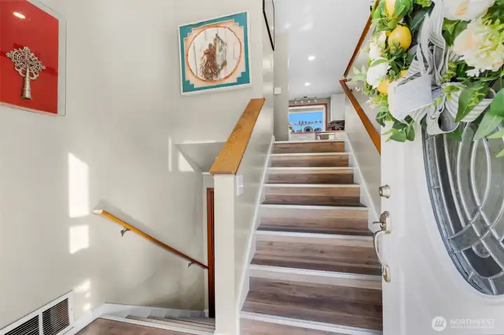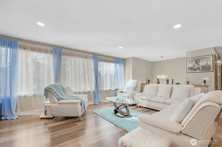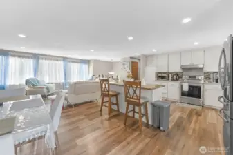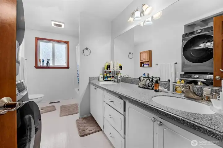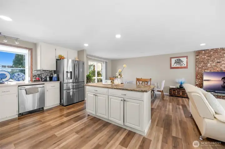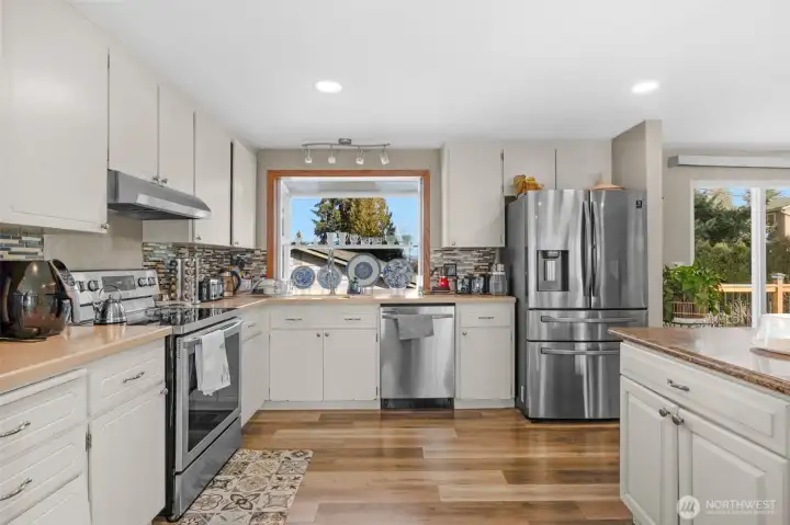 Beautifully updated home with spacious living room featuring new LVP flooring, large windows for abundant natural light, and a focal fireplace. Open-concept design flows into the dining area and kitchen. Upper kitchen boasts a large island, stainless steel appliances, garden window, and access to a generous wraparound deck—ideal for entertaining. Primary bedroom includes a ¾ bath with tile and walk-in shower. Lower-level great room offers a fireplace, space for an office, second kitchen, new ¾ bath with walk-in shower and tile, plus 4th and 5th bedrooms. Two kitchens and two washer/dryer setups provide excellent flexibility for multi-generational living, rental income, or adult family home use. Solid wood doors throughout, large laundry room, spacious 2-car garage, A/C, wired for generator. Corner lot in quiet, walkable, sought-after Auburn West Hill, blocks to schools and close to transit, I-5, and Hwy 167.