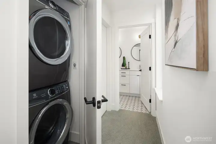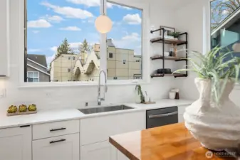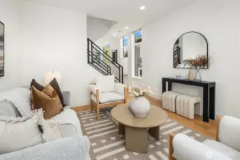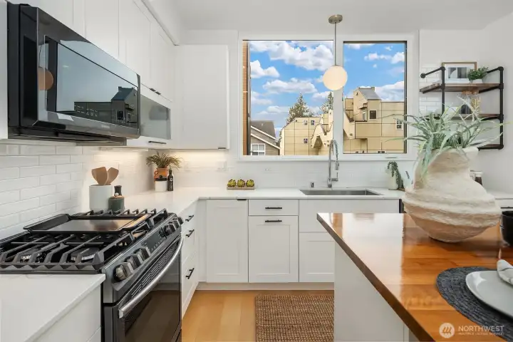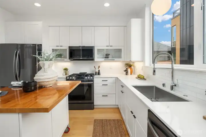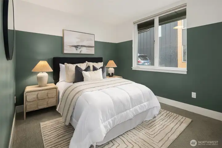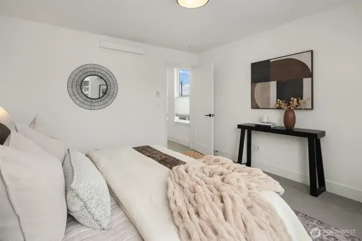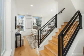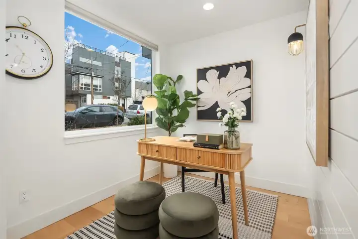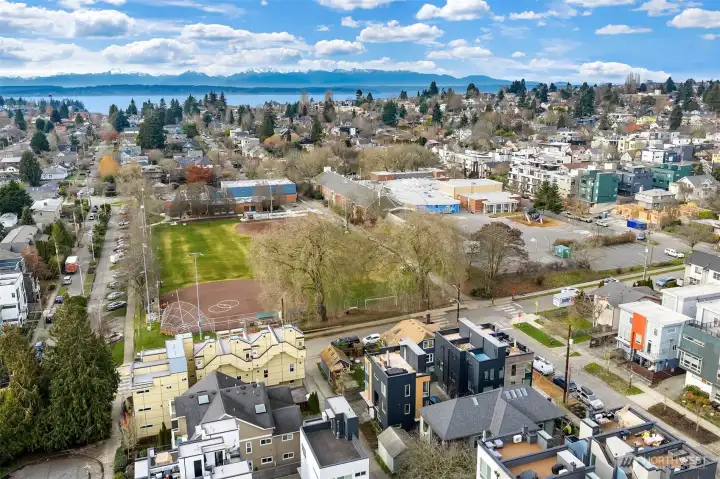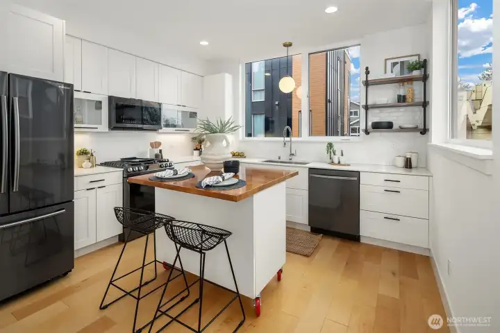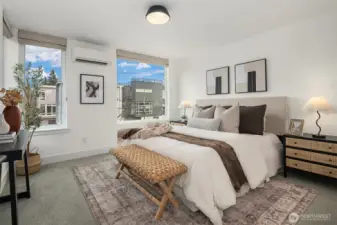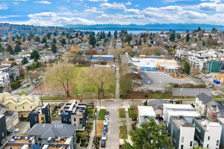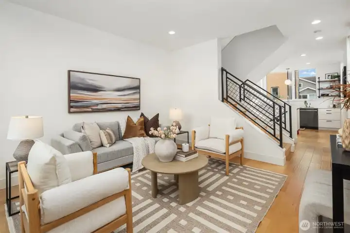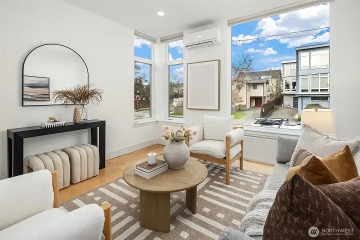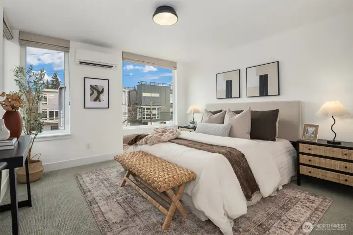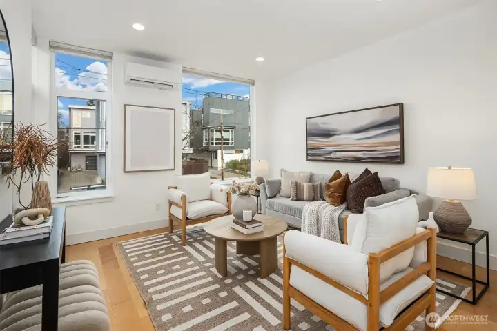 A standout end unit in a fantastic Ballard location just steps to favorite cafes, restaurants, shops, and parks with easy access to transit, downtown, and South Lake Union. An exceptional floor plan places the kitchen and living space on the second floor, creating a light filled and open main living area with oversized windows throughout. The expansive chefs kitchen with generous eating space is a rare townhome find. The spacious primary bedroom features floor to ceiling windows, a beautiful primary bath with double vanity, and an impressively large walk in closet. The second bedroom with a full bath is perfect for guests or flexible living. A bonus workspace and mud room area with an oversized entry closet provide excellent everyday functionality and storage. Enjoy an incredible rooftop deck with two patios ideal for entertaining or relaxing plus one off-street dedicated parking space and air conditioning... this one truly checks all the boxes!