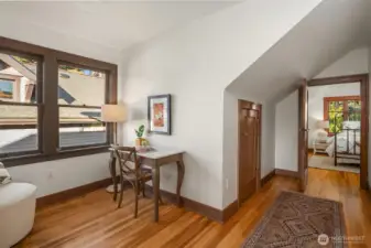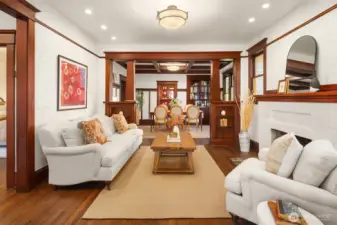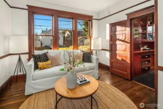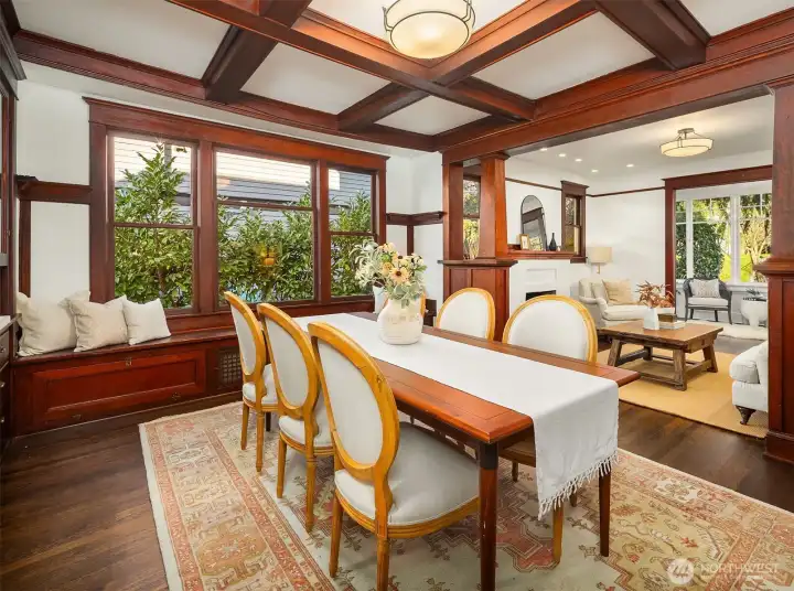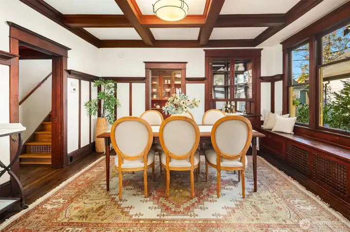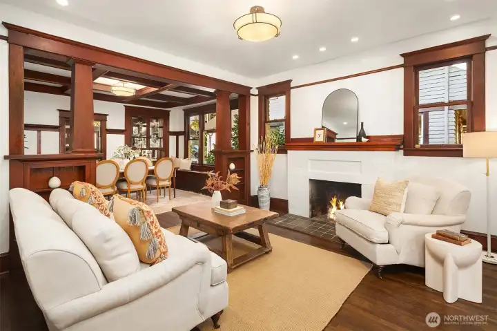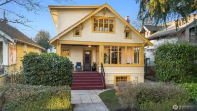 Classic 1920s Craftsman w/timeless appeal, set in Seattle’s vibrant University Heights neighborhood—a home that feels welcoming from the moment you arrive. This 5+ bedroom, 2.75 bath residence features a covered front porch & formal entry, flanked by a sunroom wrapped in tall windows & filled w/natural light. A gracious living room w/mantled wood-burning fireplace flows into an oversized formal dining room w/striking box-beam ceilings, a seating bench with hidden storage, plate rail molding, & original glass-fronted built-in bar. The kitchen blends period character w/modern convenience, offers generous cabinetry & counters, recessed lighting, a built-in hutch, stainless gas stove, & access to an elevated rear porch. A large office & full bath complete the main level. Upstairs offers three bedrooms w/walk-in closets & a full bath. Refinished hardwood floors on the main & upper levels, paired w/fir millwork & crystal & brass hardware, highlight the home’s enduring character. System updates include electrical, plumbing, roof, fresh interior & exterior paint, newer furnace, and hot water tank. Street-to-alley access w/rare 5-car off-street parking, well-designed storage & generous closets. The finished lower level offers a “kitchen-ready” area, ¾ bath, gear room, & flexible spaces for guests, work-from-home, or income potential. Quietly set on a tree-lined street with a 93 Walk Score—close to parks, transit, and UW—this home reflects pride of ownership & is move-in ready.
