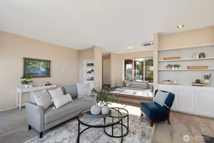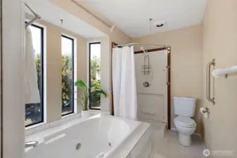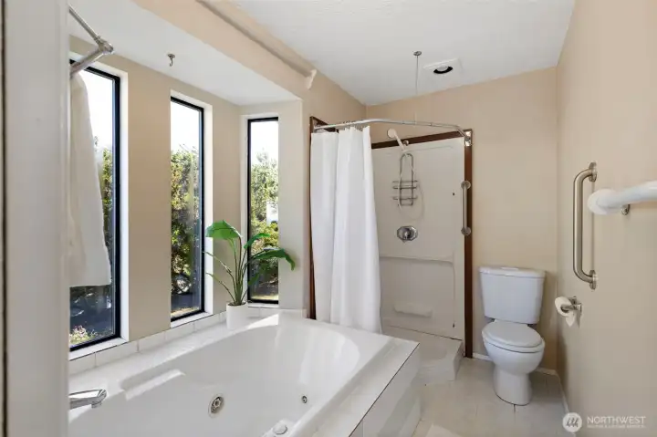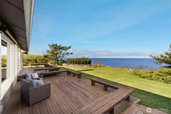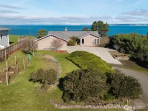 Expansive, panoramic views of the Strait of Juan de Fuca, the San Juan Islands, the Cascade Mountains, and Whidbey Island set the tone for this exceptional Port Townsend home. Perched on four lots in a quiet, off-the-beaten-path setting, the property offers rare privacy while remaining in the heart of town. Designed for comfortable main-level living, the home features zero-threshold entry from the attached two-car garage, creating seamless accessibility. The primary bedroom with ensuite bath opens directly onto the deck—an extraordinary vantage point for soaking in the ever-changing water and mountain views. Nearly every room in the home captures a breathtaking outlook. The user-friendly kitchen is both warm and functional, highlighted by a handmade wooden countertop crafted by the seller’s son—an artisan detail that adds character and heart. Two fireplaces—one wood-burning and one propane—offer cozy gathering spaces year-round. Downstairs, a spacious recreation room and third bedroom with a ¾ bath provide ideal flexibility for guests, hobbies, or multi-generational living. A rare opportunity to enjoy sweeping views, generous space, and peaceful privacy—all just moments from everything Port Townsend has to offer.