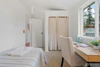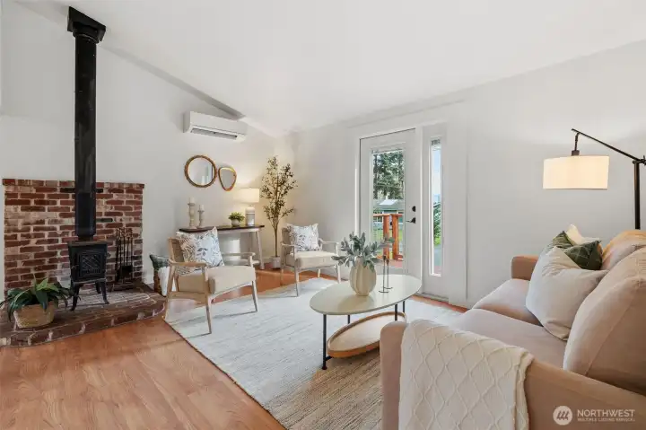 Imagine… your own little piece of paradise on Whidbey Island. Nestled in a charming beach community with peek-a-boo views of the Sound and ferries passing by, this inviting cottage offers the perfect blend of comfort and island lifestyle — plus community beach access just moments away. Cozy up by the wood stove in the inviting living space that flows seamlessly into an open, spacious kitchen with French doors leading to the patio. A front deck faces the water, perfect for relaxing summer afternoons while taking in mountain and sound views. The fenced yard offers room to garden, play, or expand. Upstairs, the primary bedroom features Sound and mountain views and a private ¾ bath en suite. A second bedroom and full bath are located on the main level. The detached 288 sq ft garage has been converted into a studio with French doors, creating a perfect flex space for guests, work, or hobbies. An additional storage area is located on the studio's back side. Conveniently located near the Clinton ferry, library, shops, and restaurants — and just 10 minutes to the seaside village of Langley with its marina, galleries, parks, and dining. This is Whidbey living at its best. Imagine… living the life you love.