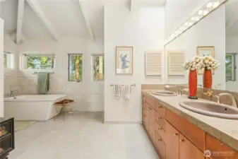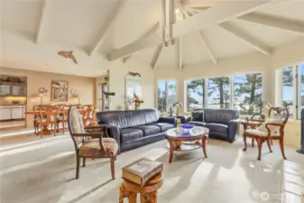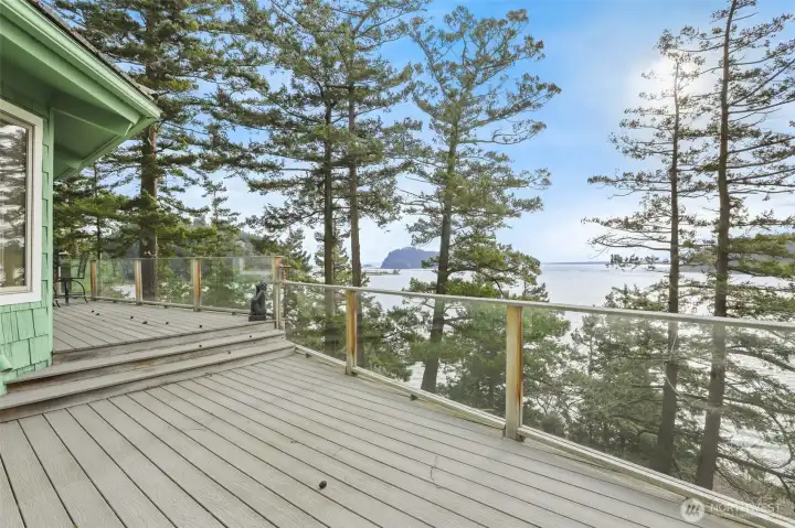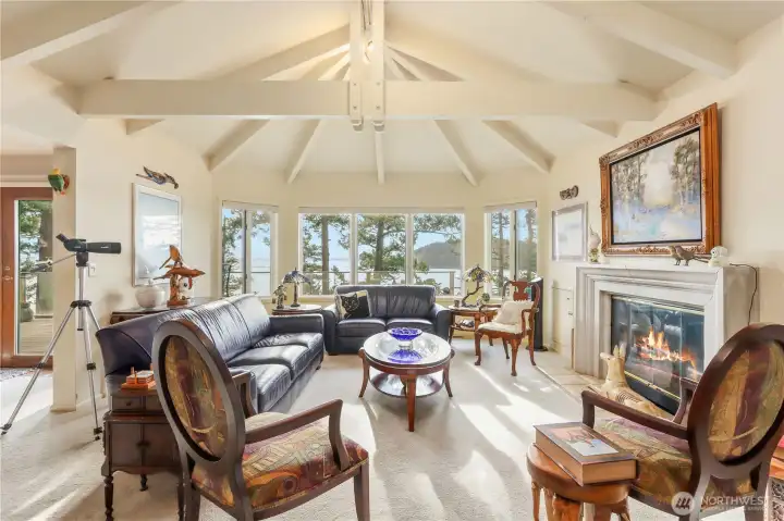 Experience commanding, unobstructed views from an exceptional NW custom home set on a rare double lot surrounded by towering Douglas firs and natural rock landscaping. Vaulted ceilings with striking exposed beams and walls of windows flood the open floor plan with light while framing ever-changing scenery of boat traffic along the Swinomish Channel, soaring eagles, blue herons, trumpeter swans, snow geese, and panoramic vistas of Whidbey, Goat and Ika Islands, the North Cascades and Mt. Rainier. Main level living features a spacious great room with wood-burning fireplace, den and office, formal dining with slider to a EverGrain composite deck for low-maintenance outdoor living with glass railing, and a well-appointed kitchen with granite countertops, double ovens and abundant storage. The foyer welcomes with warm Spanish tile, setting the tone for the home’s timeless design. The primary suite is a retreat with deck access, stunning views, walk-in closet, and a beautifully updated bath designed for accessibility with heated floors, soaking tub and walk-in shower. Upstairs offers a private guest suite with en-suite bath and balcony. Bonus hobby room, extensive storage, motorized blinds, Trane central heating, generator wiring, and a garage with workspace, half bath and utility sink add everyday function. Located in Shelter Bay with pools, golf, tennis, marina, beaches and clubhouse amenities, this home blends comfort, craftsmanship and a truly unforgettable setting.