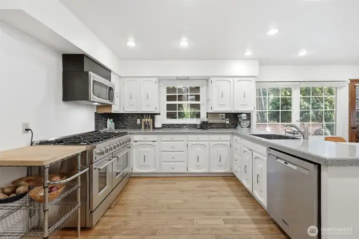 Located on a corner lot in the established Meadow Estates neighborhood, this unique home offers over 3,800 square feet with a flexible layout suited for a variety of living needs. The main living areas are filled with natural light and include multiple spaces for gathering, working, or relaxing. The kitchen features granite counters, a chef’s stove, stainless steel appliances, and pantry storage. Recent updates include brand new roof, electrical panel, new upstairs carpet, and remodeled bathrooms! The primary suite includes an oversized, wood-lined walk-in closet that could double as a nursery, office, or workout area and a private balcony. The upstairs separate living area includes a fifth bedroom, bathroom, living space, and a brand-new kitchen, with exterior access—ideal for an ADU, multi-generational living, or guest quarters. The 10,000 square foot lot offers a usable yard with mature trees, fencing, patio space, sprinklers, RV parking, a three-car attached garage, attached workshop, and additional storage. Located near Green Meadows Golf Course, this home offers size, versatility, and long-term potential in a well-established neighborhood.