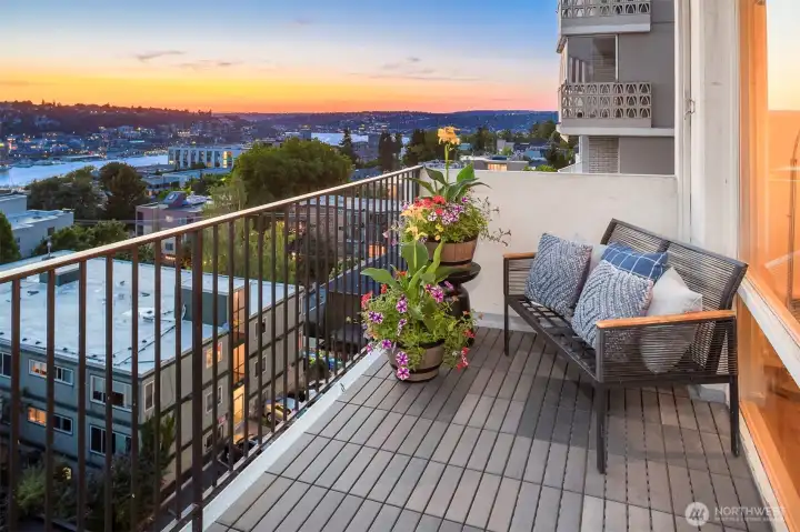 Iconic views await at The Lamplighter! This rare 8th-floor corner unit offers a wall of windows showcasing a massive private terrace with sweeping views of downtown Seattle, the Space Needle, Puget Sound, the Olympic Mountains, & South Lake Union. The open-concept layout includes a beautifully updated kitchen, refreshed finishes throughout, view-facing living throughout & in-unit laundry. The Lamplighter is a solid concrete-&-steel, mid-century gem offering an outdoor pool, community space, secured parking space, storage unit, & ample guest parking! Located on a quiet, tree-lined street in the historic Harvard-Belmont district—just blocks from light rail, cafes, gyms, grocery stores, & Volunteer Park—this is quintessential Cap Hill living!