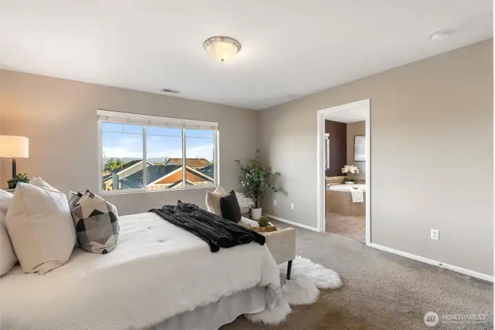Beautifully positioned to capture stunning views of Lake Stevens and the surrounding mountains, this spacious 4-bedroom, 2.75-bath home offers the perfect blend of comfort, style, and convenience. The open-concept main living area features 9-foot ceilings, a cozy gas fireplace, and abundant natural light, creating an inviting space that feels even larger than it is. The well-appointed kitchen includes granite countertops, a breakfast bar, and a dining area ideal for everyday living or entertaining. A main-level bedroom with a ¾ bath provides excellent flexibility for guests, multi-generational living, or a home office. Upstairs, the expansive primary suite showcases breathtaking scenery, a walk-in closet, and a luxurious 5-piece ensuite bath. Two additional bedrooms and a convenient upstairs laundry complete the upper level. Step outside to the covered deck—perfect for relaxing. Additional highlights include air conditioning and a 743 sq. ft, 2+ car garage offering exceptional storage. Located in the highly sought-after Lake Stevens School District and just minutes to Frontier Park, Lundeen Park, shopping, dining, and easy highway access. Enjoy generous space with easy maintenance—this home truly has it all. Welcome home!