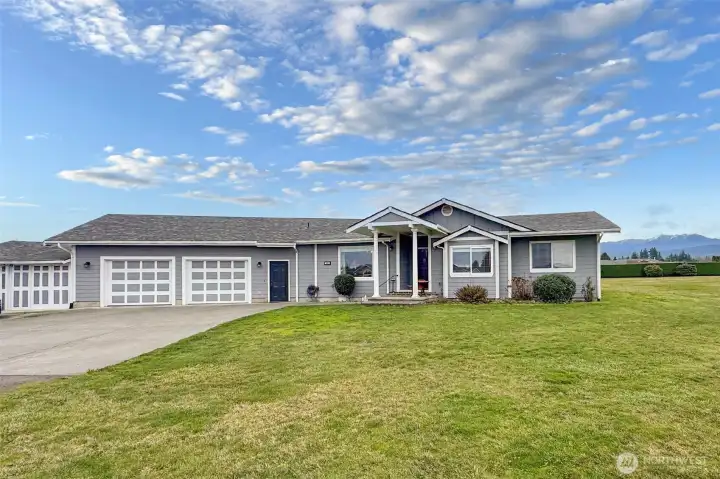 Unobstructed mountain views on 1 acre! On a clear day you can see forever - the snow-capped Olympic Mountains & Hurricane Ridge - it will be hard to find a better view than this! This 2,302 square foot one story home has 3 bedrooms and 2 1/2 bathrooms. The living room has 3 skylights and a multi-sided propane fireplace that also opens into the dining area. Solid surface flooring makes it easy care and all the windows on the south side have been replaced which enhances the natural light. The spacious kitchen has lots of cupboards, an island with breakfast bar and prep sink, 2 pantries, propane cook top, and a plant window. The formal dining room is large and would also make a great office. There are 2 hot water heaters - 1 at each end of the house so you never run out of hot water - 1 tank is brand new. The primary bedroom has a large walk-in closet and door onto the deck and an en-suite with a real claw foot tub, a separate shower, and double sinks. The other bedrooms are good sized and there is a half bath off the laundry room for guests. The garage has 744 sq ft and has a pull-down ladder that accesses storage space. The Trex deck has Southern exposure with room for patio furniture and off the deck is a hot tub, lavender, and dog run. The carport was enclosed to make a 252 sq ft music room that was insulated to make it sound proof - also great for storage or a hobby room. Relax and enjoy this peaceful setting close to town.
