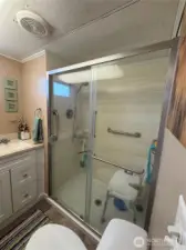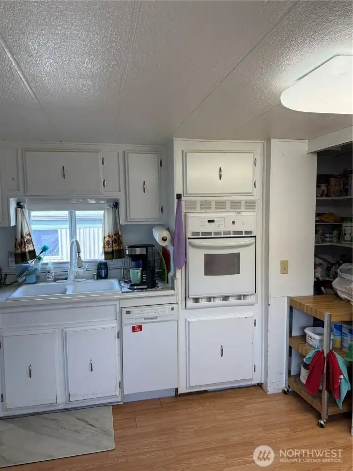 Charming home in Lakeway Estates. Close to shopping, restaurants, buses & downtown. This home sits in a great location in the middle of the park. Big windows bring in the light into the large living room. The kitchen has space to move around and a sizable pantry. 2 bedrooms are tucked away at the back. The bathroom has been completely remodeled w/safety in mind. The roof is new, the hot water tank is 2 years new & the furnace is 3 years new. There is an enclosed doggy play area off to the side. A sturdy wheelchair ramp connects the carport to the side entrance. Extra-large shed w/electricity. Includes all appliances - LG frontload W/D. The clubhouse offers an extension of your home w/a full kitchen, TV area, library, billiards, hair salon & laundry. Across from Fred Meyers & on main a bus route.
