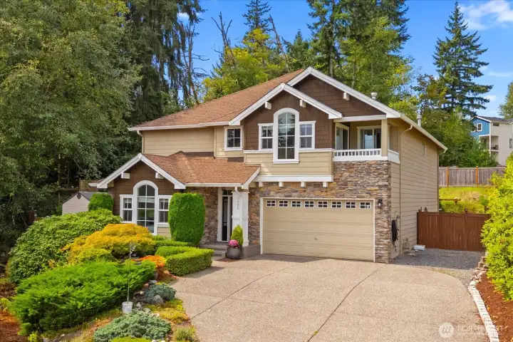 East-facing Willow Creek home with fantastic Cascade Mountain views! 3,290 sq ft of living space with open vaulted ceilings & gleaming hardwood floors. 4 bed/2.5 bathrooms + bonus room, and a main floor office or guest room. The open kitchen features island with bar seating, stainless steel appliances, and a generous eat in space (plus formal dining room). Great room concept--open living area includes a cozy gas fireplace. Upstairs, enjoy the open landing area looking down to the entryway. French doors into the spacious primary suite! 5-piece bath, walk-in closet, sitting area & private balcony to soak in breathtaking mountain views. A true retreat! Set on a private lot with mature landscaping, this home backs to a greenbelt and sits elevated from the street. An expansive patio with room to entertain. Enjoy nature and wildlife from the private backyard. Neighboring lot to the north is a protected area, offering even more privacy. Located in the highly sought-after Snohomish School District (Glacier Peak). Walking distance to Willis Tucker park, close to shopping & restaurants, and major highways for easy access.