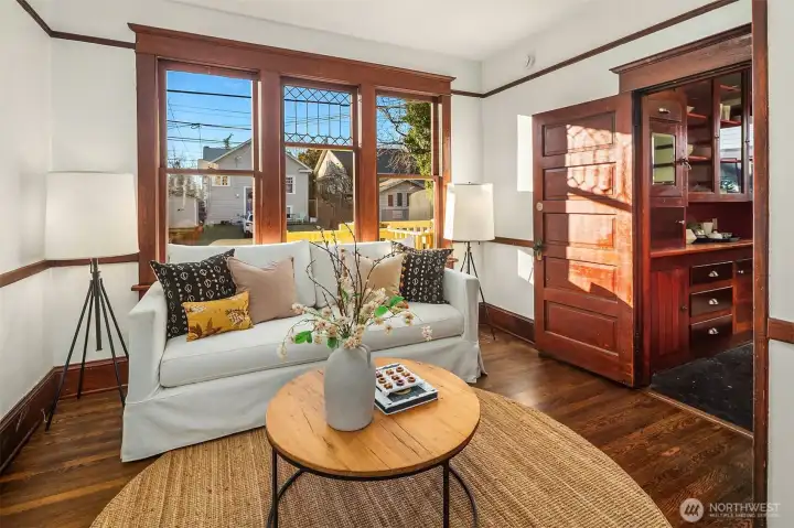 Classic 1920s Craftsman w/timeless appeal, set in Seattle’s vibrant University Heights neighborhood—a home that feels welcoming from the moment you arrive. This 5+ bedroom, 2.75 bath residence features a covered front porch & formal entry, flanked by a sunroom wrapped in tall windows & filled w/natural light. A gracious living room w/mantled wood-burning fireplace flows into an oversized formal dining room w/striking box-beam ceilings, a seating bench with hidden storage, plate rail molding, & original glass-fronted built-in bar. The kitchen blends period character w/modern convenience, offers generous cabinetry & counters, recessed lighting, a built-in hutch, stainless gas stove, & access to an elevated rear porch. A large office & full bath complete the main level. Upstairs offers three bedrooms w/walk-in closets & a full bath. Refinished hardwood floors on the main & upper levels, paired w/fir millwork & crystal & brass hardware, highlight the home’s enduring character. System updates include electrical, plumbing, roof, fresh interior & exterior paint, newer furnace, and hot water tank. Street-to-alley access w/rare 5-car off-street parking, well-designed storage & generous closets. The finished lower level offers a “kitchen-ready” area, ¾ bath, gear room, & flexible spaces for guests, work-from-home, or income potential. Quietly set on a tree-lined street with a 93 Walk Score—close to parks, transit, and UW—this home reflects pride of ownership & is move-in ready.