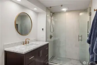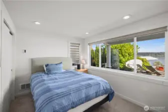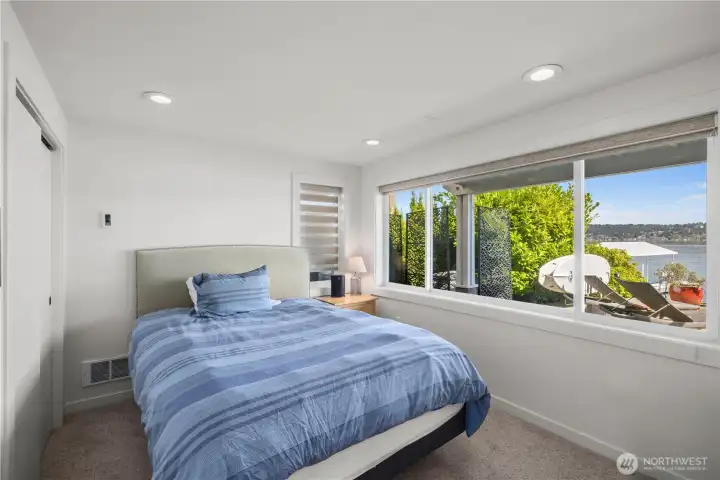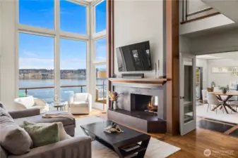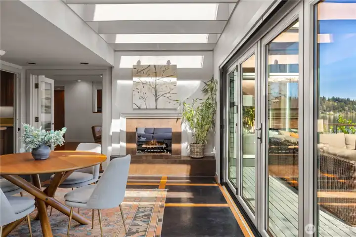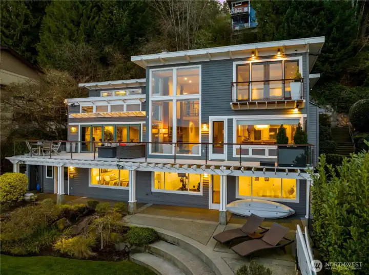 Tucked on a quiet lakeside lane with 90’ of private Lake Sammamish shoreline, this NW contemporary retreat is a study in light, style, and serenity. Two-story windows and skylights fill the home with natural light, from the great room to the airy sunroom where lake breezes drift through the open NanaWall. Swim off the expansive dock, cast a line in the cove, or retreat to the cozy theater with wet bar. Evenings invite sunset dinners on the full-width deck, followed by a soak in the secluded hot tub tucked amidst lush landscaping. Upstairs, the serene primary suite offers storm-watching solitude and sweeping views. Extensively updated and thoughtfully designed—with rare 8-car parking— this is active waterfront living, beautifully refined.