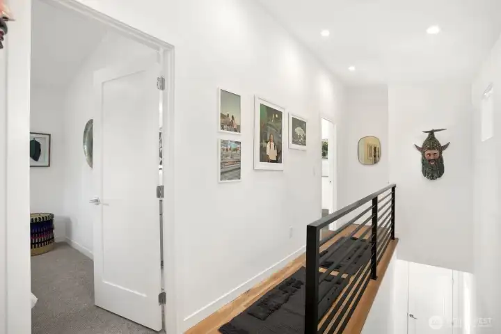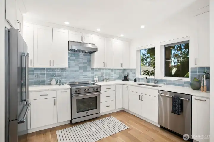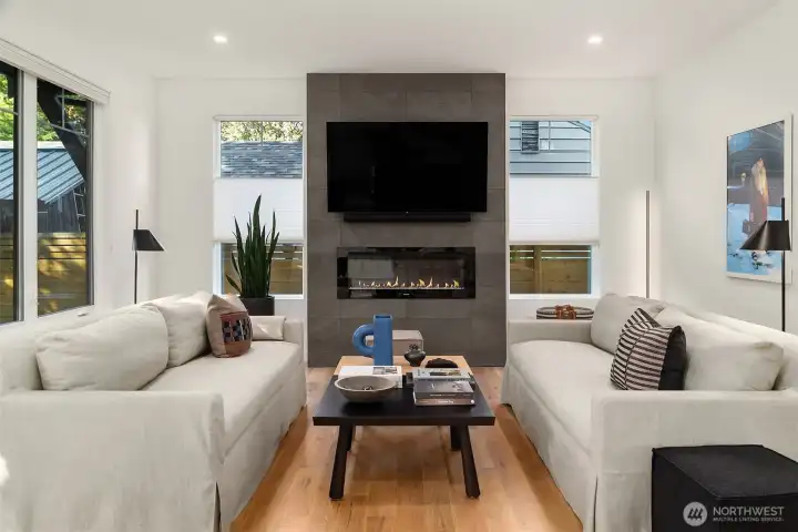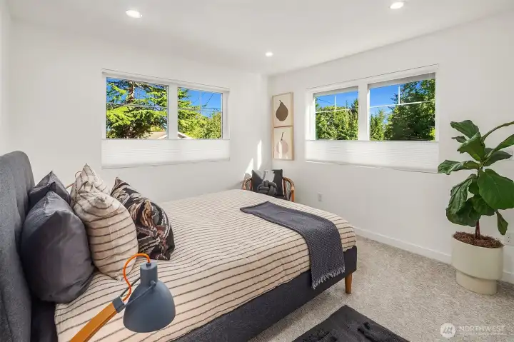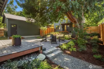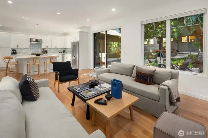 Stunning Modern Farmhouse 2-Home Compound totaling 3,393 SF with 6 BEDs, 5.25 BAs, with a detached garage—rare, design-forward living with flexibility for multigenerational households, income potential, a luxe guest house, or inspired work/life separation. Thoughtfully re-envisioned and better than new, with elevated upgrades throughout: top-down/bottom-up blinds, designer lighting (HAY & DWR), Lutron smart tech, bespoke storage (Shelf Genie & ELFA), and distinctive décor touches. Seamless indoor-outdoor living centers on a magical, sun-dappled, fully fenced courtyard. Professional landscaping with decks, patios, pathways, and easy-care plantings, plus SMART landscape lighting and irrigation. High-quality cedar fencing and a custom utility meter enclosure underscore the attention to detail. The 2,326 SF 4BD/2.75BA main house features an airy, light-filled Great Room & culinary kitchen with induction range. A main-level 4th bedroom next to a ¾ bath is ideal for a den/office or easy-access bedroom; upstairs, the primary suite offers a walk-in closet and double-head shower. The 1,067 SF 2BD/2.5BA guest house/DADU offers a sunlit open plan, main-level ½ bath, and two upstairs bedrooms—each with own full bath. Both homes include white oak floors, ductless A/C, and EV-prewired parking. In one of the friendliest neighborhoods in Seattle - minutes to Endolyne, Lincoln Park, shops & eateries—15 minutes to SeaTac Airport, yet blissfully quiet. Garage + Lots of off-street parking.