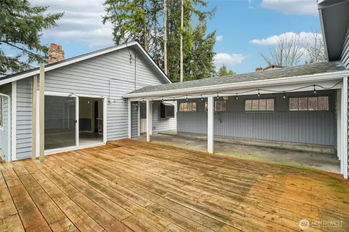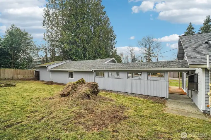 Charming rambler on a generous 12,000 square foot corner lot. Convenient Lynnwood location with quick access to I-5, Hwy 99 and core shopping. New roof in 2025 and new flooring throughout. Move in ready with updates in both kitchen and bathroom. Large dining and living room spaces and a wood burning fireplace. Covered walkway connects house to large detached garage, workshop, bonus room and carport. Entertainment sized west facing deck and fully fenced backyard with mature landscapes. Covered walkway leads to a detached garage w/workshop/extra finished room, and carport. Driveway parking for multiple cars, RV and all the toys.