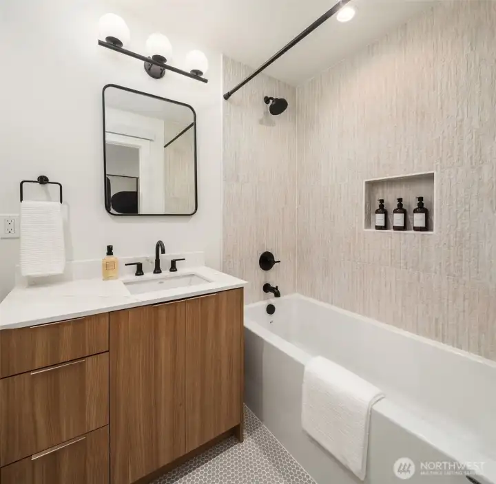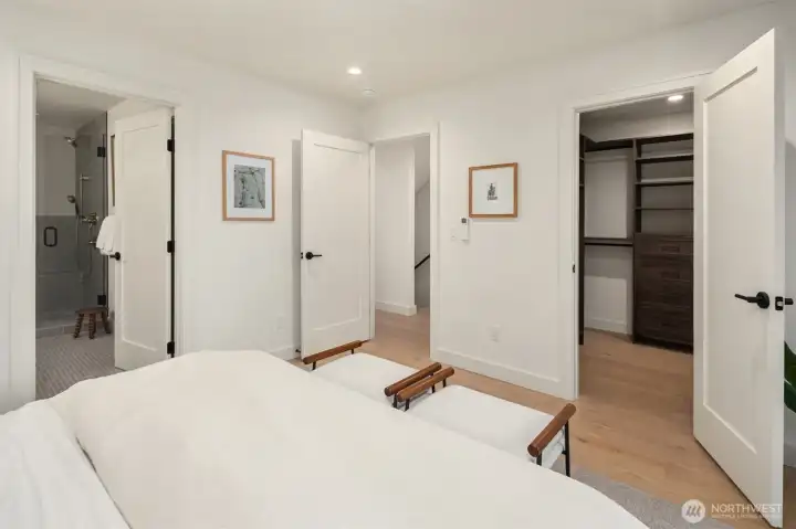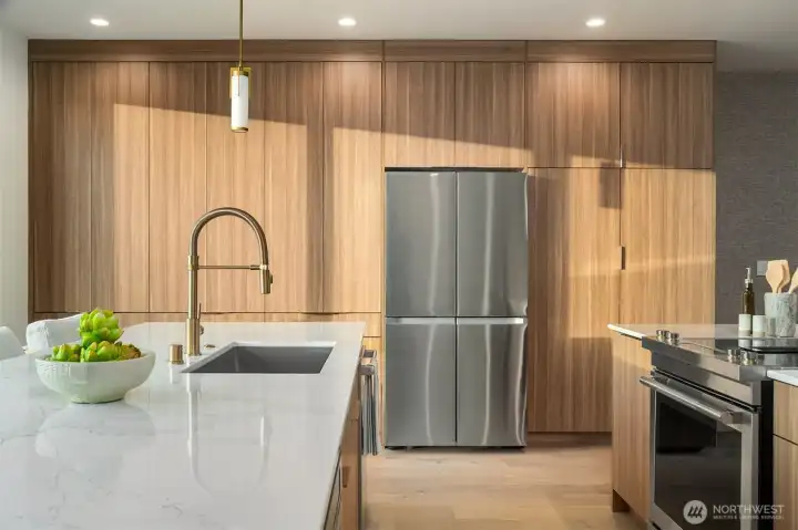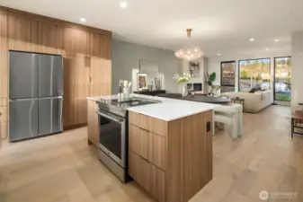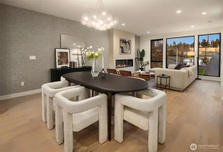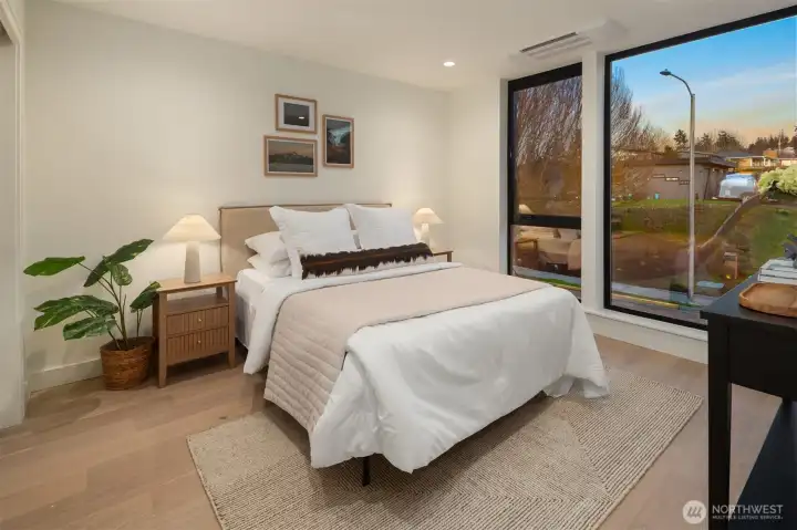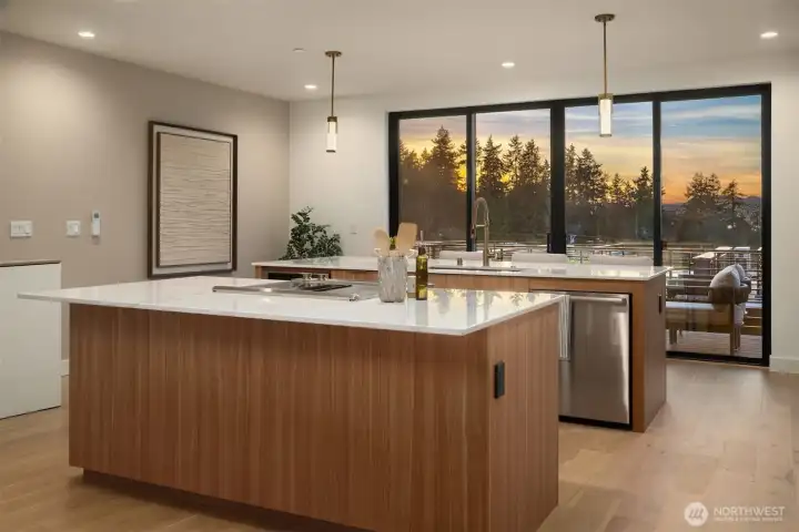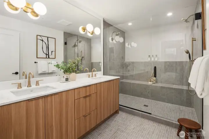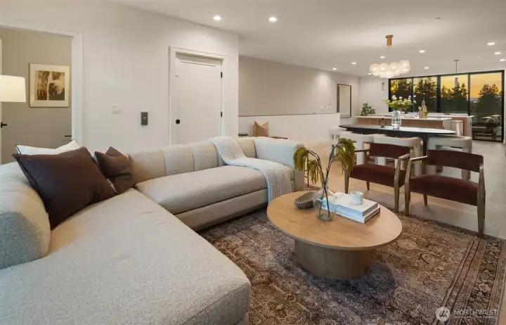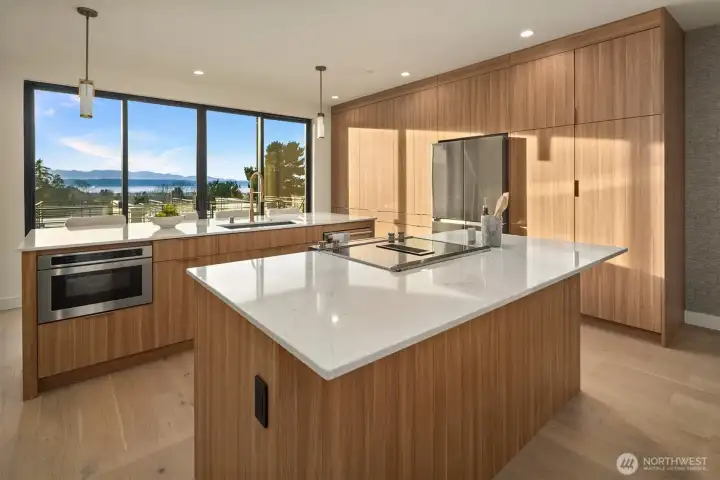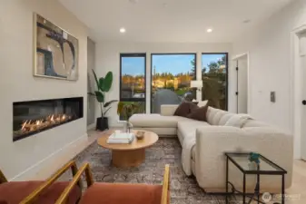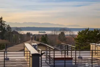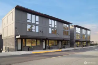 Sound & Olympic Mountain views steal the show from this new construction penthouse unit, paired with a truly walkable downtown Edmonds location just steps to shops, dining, and waterfront. Modern and hip + a private elevator, designed with a reverse floorplan is thoughtfully designed to capture the views at every turn. Upper level lives beautifully, anchored by an open great room with expansive west-facing windows and seamless access to a sunset-view deck, perfect for evening unwinding or entertaining. Clean, current finishes define the space, from wide-plank white oak floors to sleek lines and curated designer lighting throughout. Kitchen is equal parts stylish and functional, featuring a full suite of stainless-steel Dacor appliances, flat-panel cabinetry, and two Daltile Monte Lucia quartzite islands that make hosting or casual meals feel effortless. Upstairs living, downstairs flexibility, the main-level space is zoned for a low-density business or use as a rec-room. Primary suite offers a comfortable retreat with a walk-in closet and ¾ bath. Mini-split heating and cooling keep things comfortable year-round. Modern, low-maintenance, and right in the heart of it all this is an easy place to love, with a 4.875% builder rate as an added bonus.