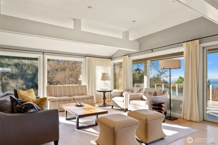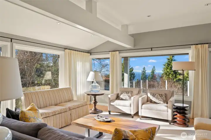 Tucked at the end of a private drive on an expansive 36,768 s ft shy-acre lot, this fully updated Edmonds retreat offers breathtaking views of Puget Sound and Whidbey Island from a setting that feels worlds away. Surrounded by trees and sky, the home lives like a luxury treehouse – private, peaceful, and elevated above it all. The main living spaces are open and light-filled, featuring hardwood floors, a statement fireplace, and seamless flow to an expansive entertainment deck complete with a hot tub – perfect for sunset watching or year-round gatherings. The kitchen is designed for both function and style, offering abundant storage, a large center island with gas cooktop, and stainless appliances, all opening to a dedicated dining area. The upper level is anchored by a stunning primary suite with spa-inspired bath, including a slipper tub, walk-in shower, and generous walk-in closet. The lower level adds flexible living with a family room featuring a second fireplace, custom built-ins, and a wet bar, along with additional private guest space. Outdoor living is just as impressive with a stamped concrete patio, expansive backyard, and a heated shop/studio is ideal for hobbies, creative space, or additional storage. Every detail has been thoughtfully updated with luxury finishes throughout, creating a home that feels both refined and effortlessly livable – private, serene, and truly one of a kind.