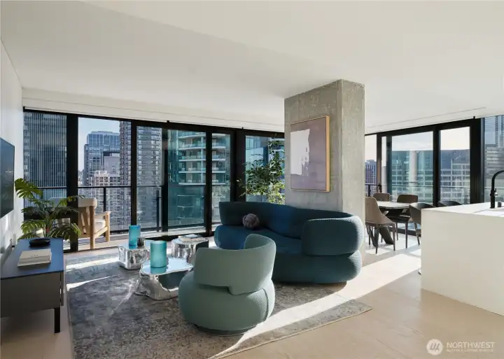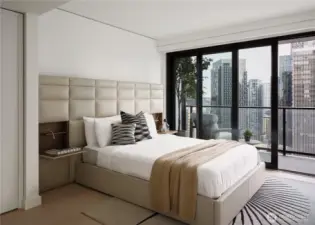 First Light, designed by architect James KM Cheng and glass artist John Hogan is Westbank’s latest residential tower in Downtown Seattle. This Southeast 2 Bedroom Home offers an expansive layout, with a wraparound balcony and 1.75 bathrooms. Floor-to-ceiling, triple-paned windows allow for spectacular views of the Puget Sound, and City. Each home features custom-designed interiors by the architect and includes custom B&B Italia cabinetry, light finishes with contrasting details, Kohler fixtures, Miele appliances, keyless entry & hardwoods throughout. Amenities include a 47th floor 25-meter rooftop sky pool & jacuzzies, rooftop garden, fitness & wellness center, bike lounge, pet play area, spa & residents lounge.