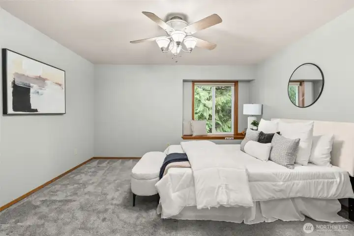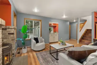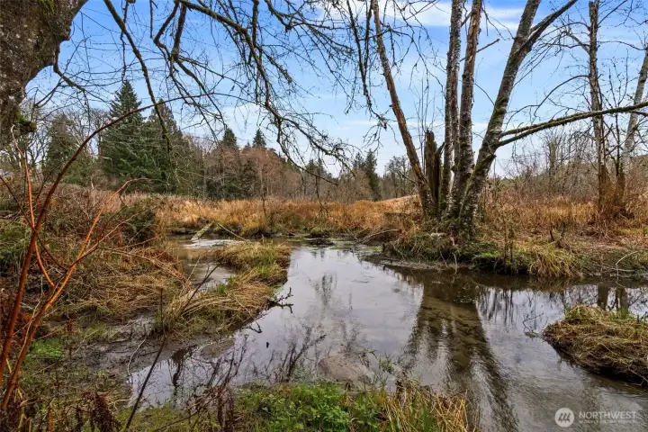 Private home on a rare just-shy acre lot in the Tumwater School District, offering 2,600+ sq ft of well-maintained living space. Bright, open layout offering two main-level living areas, formal dining, a breakfast nook, and a built-in work or study space. The kitchen is equipped with granite countertops, a gas cooktop, and opens to the living room. Double staircase adds charm, while gas and pellet stove fireplaces provide warmth and ambiance. Upstairs offers spacious bedrooms and a primary suite with walk-in closet and ensuite bath with tile floors and soaking tub. Enjoy peaceful outdoor living with a gentle creek, beaver pond, and surrounding wildlife. Easy-maintenance landscaping means no lawn mower needed. Includes washer, dryer, and 8x12 shed. Conveniently located near parks, shopping, schools, and everyday amenities.