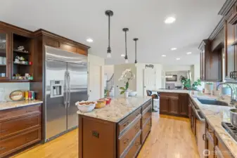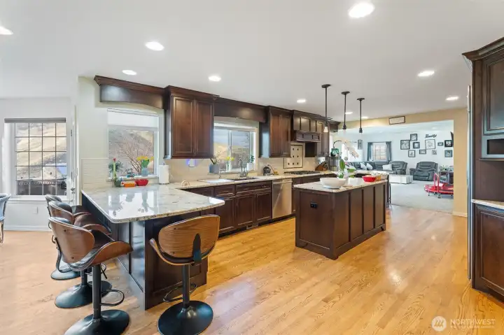 Stunning Broadview traditional two-story home offering breathtaking views of the mountains, city, and Columbia River. Thoughtfully designed for privacy and entertaining, this home features a unique upper-level layout with the primary suite privately situated on one wing and a spacious guest bedroom on the opposite side. Classic brick accents, newer roof, fresh exterior paint, and a desirable 3-car garage add timeless appeal. The gourmet kitchen is a showstopper with gas range, Sub-Zero refrigerator, double ovens, and a massive island—perfect for hosting and everyday living. Light-filled formal dining and living rooms feature contemporary accents. An impressive addition includes a large second family room and a private guest suite with separate living space, bedroom, and full bath. The primary suite boasts vaulted ceilings, abundant natural light, and a fireplace, with a spa-like en suite featuring a soaking tub and walk-in glass block shower. Step outside to the beautiful back deck and take in sweeping mountain views while enjoying the built-in BBQ—an entertainer’s dream and the perfect setting for unforgettable evenings. HOA amenities include access to the community pool. This is Broadview living at its finest—space, views, privacy, and timeless elegance all in one remarkable home.