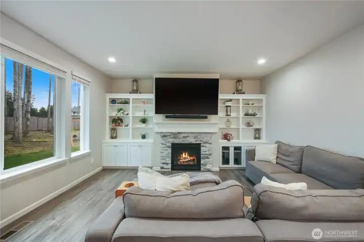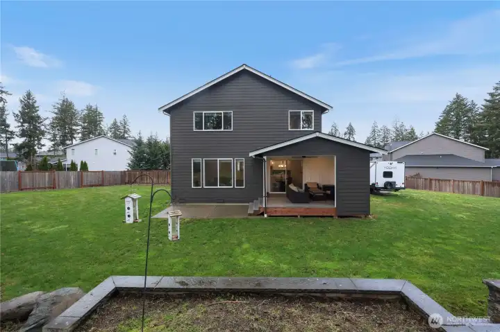 Set on a fully fenced .73-acre lot, this 2,692 sq ft, 4-bedroom, 2.5-bath Silverhawk home blends thoughtful design with standout indoor–outdoor living. The main level features durable laminate flooring throughout, a dedicated home office, and a welcoming living room with gas fireplace and custom built-in cabinetry—equal parts cozy and refined. The heart of the home is the kitchen, designed to gather and perform: a huge island, stainless steel appliances, custom soft-close white cabinetry, granite countertops, and a walk-in custom pantry. The adjacent dining room is elevated by a built-in custom buffet, perfect for entertaining and everyday ease. Upstairs, classic wrought-iron railings lead to a spacious primary suite with a custom walk-in closet and spa-inspired 5-piece bath featuring a standalone soaking tub, tile and glass walk in shower and double sink vanity. Three additional bedrooms and a large media room provide flexibility for work, play, or guests. Outdoor living shines with a large covered deck, stone-surround gas fireplace, and TV wiring—ready for year-round enjoyment. The landscaped grounds include sprinklers, RV parking, retaining walls, a fire pit, and gazebo. Practical upgrades include a 3-car garage with rear roll-up door, electric car charger, tankless water heater, whole home water filter with softener, home network wiring, 95% efficiency gas furnace, and air conditioning. Space, comfort, and lifestyle—this one truly delivers.