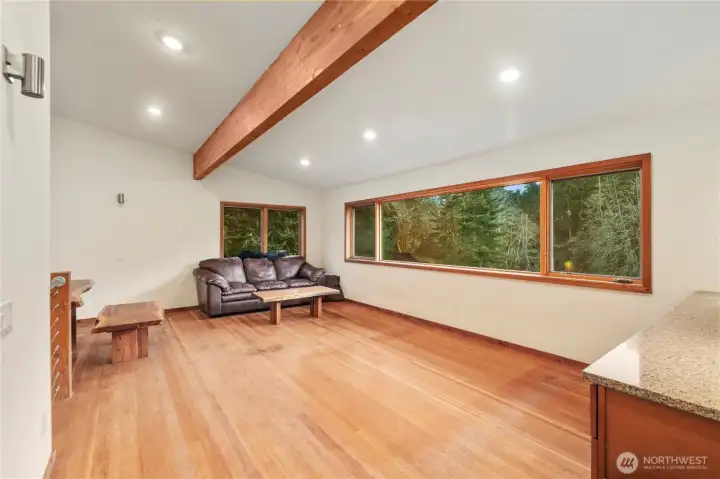 Beyond a private, set back driveway, this remarkable San Juan retreat unfolds across 10 secluded acres shaped by nature itself. A serene 3 acre, lake like pond invites quiet canoe paddles and immersive wildlife viewing, surrounded by twisted madronas and undisturbed forest. Free from ornamental gardens or pastoral affectations, the home feels carved from its setting rather than imposed upon it. Radiant heat concrete floors anchor the main level, with exposed beams and a strong architectural presence throughout. Above, a bright, lofty primary suite feels elevated, private, and refined, while a separate cozy den, once a bedroom, offers flexible living space. Large windows frame the landscape like living art. Foxes, Snow Geese, Bald Eagles, and ducks move freely across the land and water. A detached shed with power offers future ADU potential. Preserved surroundings ensure enduring privacy and a sanctuary shaped and protected by nature.