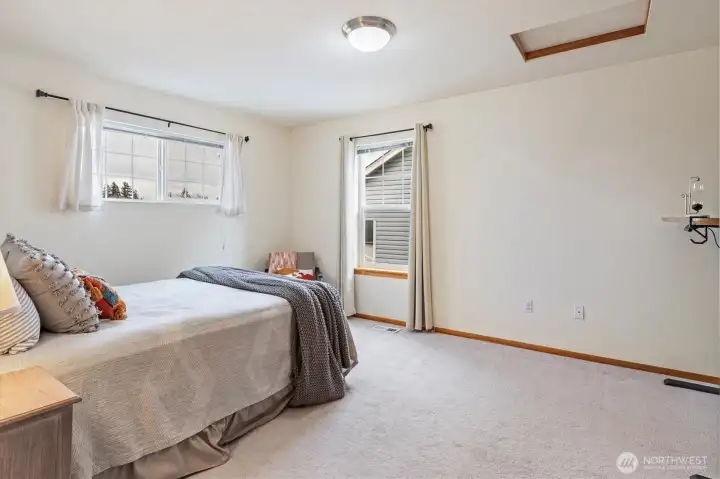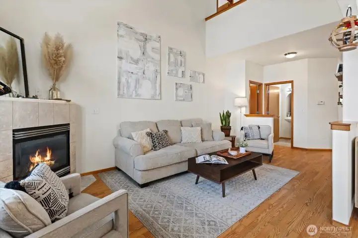 Wake up to shimmering lake views and fall in love with life in Lake Stevens! This inviting 3-bedroom, 2.5-bath air-conditioned home is thoughtfully designed to maximize comfort, space, and connection to its beautiful surroundings. The main floor welcomes you with a light-filled living and dining area centered around a cozy gas fireplace—perfect for everyday living or relaxed entertaining—while expansive windows and the adjoining deck frame tranquil views of Lake Stevens and create a seamless indoor-outdoor experience. The primary bedroom is conveniently located on the main level and offers a private retreat complete with a full ensuite bath. Upstairs, you’ll find two generously sized bedrooms, along with a versatile open loft area ideal for a home office, media room, or gaming space. A full bath and dedicated utility room with washer and dryer complete the upper level, offering both functionality and flexibility. Tucked away on a quiet cul-de-sac, the property also enjoys direct access to a neighborhood park pathway—perfect for evening strolls, playtime, or simply enjoying the outdoors. All of this is set in the heart of Lake Stevens, a community known for its small-town charm, top-rated schools, scenic beauty, and easy access to parks, trails, shopping, and dining. Whether you’re drawn to the lake lifestyle, the peaceful neighborhood setting, or the thoughtful layout of the home itself, this is a place where you can truly settle in and enjoy.