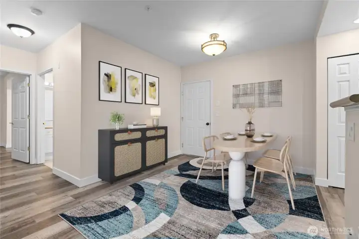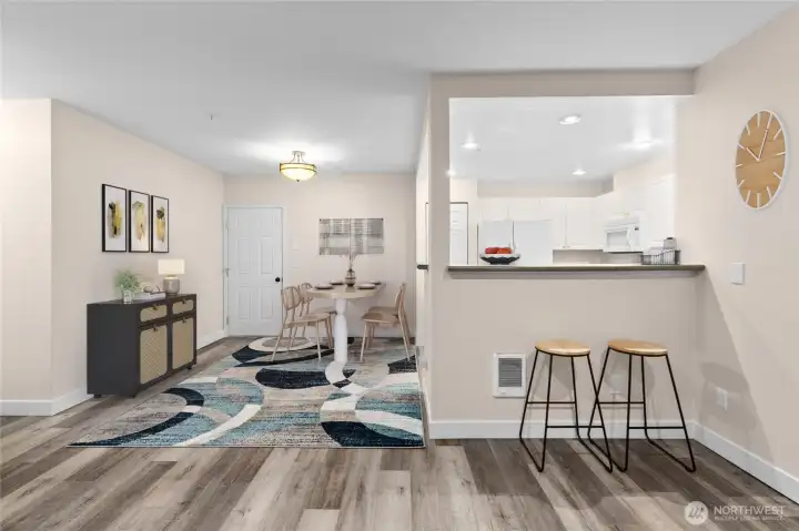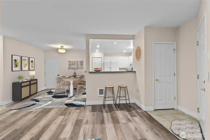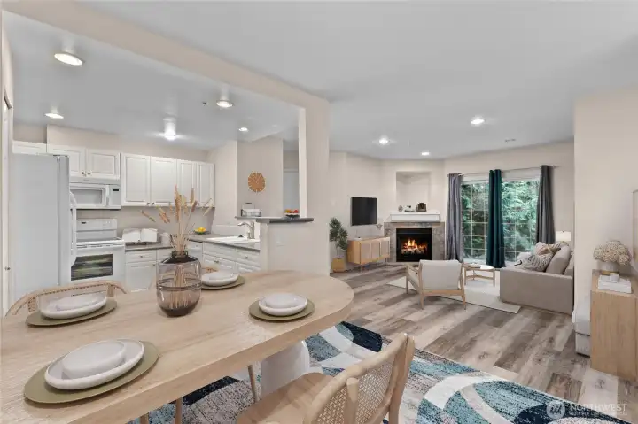 Welcome to this inviting ground-level condo offering 1,011 square feet of thoughtfully designed living space. This 2-bedroom, 1.75-bath home features durable LVP flooring that flows seamlessly throughout, creating a modern and cohesive look. The open living area centers around a cozy gas fireplace and opens directly onto a private patio—perfect for relaxing or entertaining. The well-appointed kitchen includes bar seating for casual meals, generous cabinet storage, and a separate dining area for more formal gatherings. Both bedrooms are well sized. The secondary bedroom includes convenient double closets, while the primary suite boasts a walk-in closet and its own en-suite bathroom for added privacy and convenience. Practical features include a tandem garage with space for two full-size vehicles plus extra storage. With no rental cap, this property offers excellent flexibility for investors or future planning. Located in the heart of Lynnwood, you'll enjoy quick access to diverse shopping, dining options, and major freeways for easy commuting.