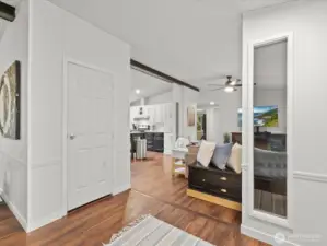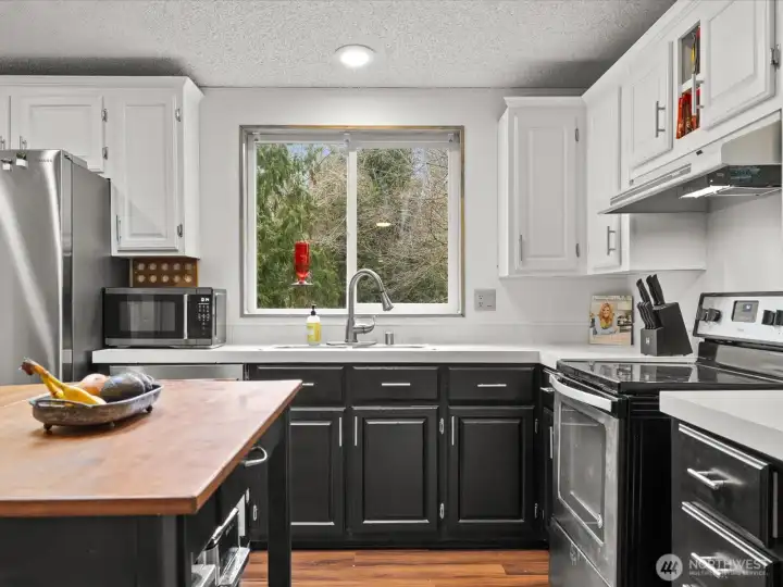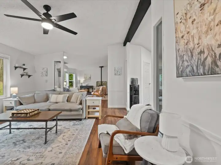 Enjoy peace & tranquility in this beautifully updated double-wide manufactured home set on just over 2.5 private acres surrounded by mature trees. Fresh interior paint, brand-new LVP flooring and trim, new double-pane windows, ceiling fan, and a new skylight fill the home with abundant natural light. The spacious floor plan offers a large living room, separate family room, and dining room—ideal for everyday living and entertaining. The kitchen features a large center island, walk-in pantry, stainless steel appliances, a brand-new refrigerator; all appliances stay. The primary suite includes a generous bedroom with an oversized 5-piece ensuite bath, plus two additional spacious bedrooms. Stay comfortable year-round with brand-new mini-splits providing efficient heating and A/C, a freestanding pellet stove that warms the entire home, and a newer water heater. Outside, enjoy a partially fenced, private lot with an outdoor fire pit, space for an RV or travel trailer, and an additional storage shed for yard tools or equipment. The extra-long detached garage offers room for two cars plus shop space—or up to four vehicles. Conveniently located near Lake Goodwin, Warm Beach, Kayak Point, fishing, swimming, and endless outdoor recreation, with quick access to I-5 Tulalip Outlets & Smokey Point's shopping, dining and amenities.