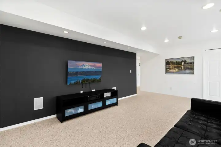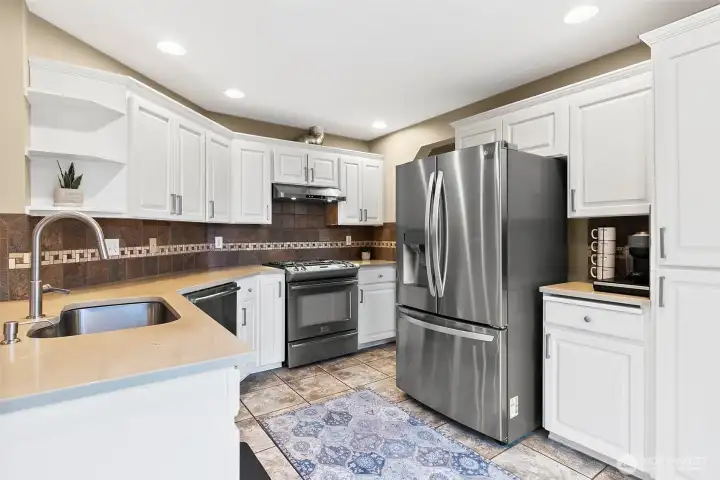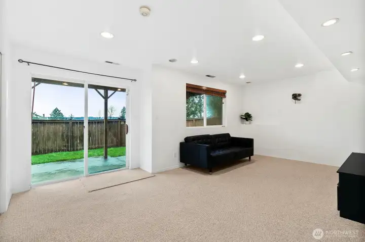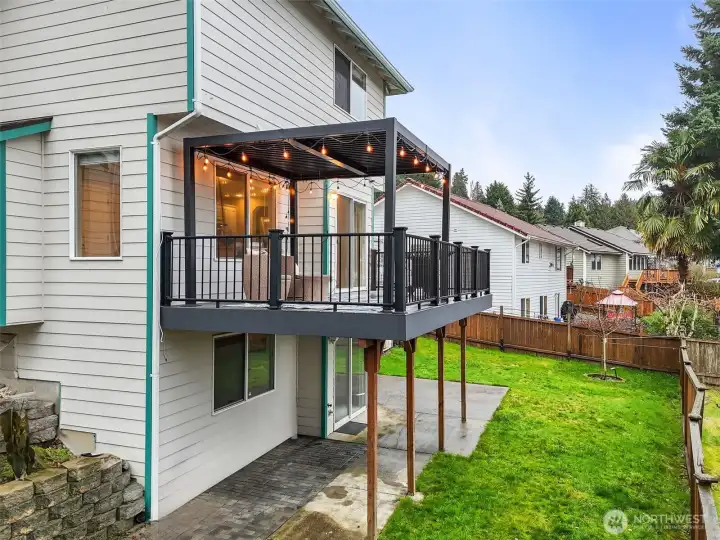 Lakeland Hills two-story home with finished basement. 4 bedrooms, 3 bathrooms, vaulted ceilings, updated lighting, and natural light throughout. Kitchen features quartz countertops, tile backsplash, and new appliances, opening to family room with gas fireplace and tile surround. New deck with retractable awning and new concrete patio lead to fully fenced backyard. Finished basement includes bedroom, bathroom, and surround sound, providing additional living space. Updates include new LVP flooring, brand-new primary bath shower, roof replaced in 2017, furnace and hot water heater updated in 2018, and extended driveway completed in 2023 for additional parking. Close to parks, schools, shopping, and amenities.