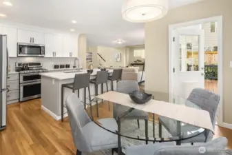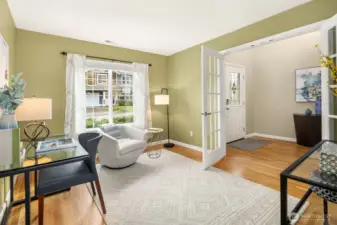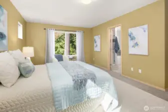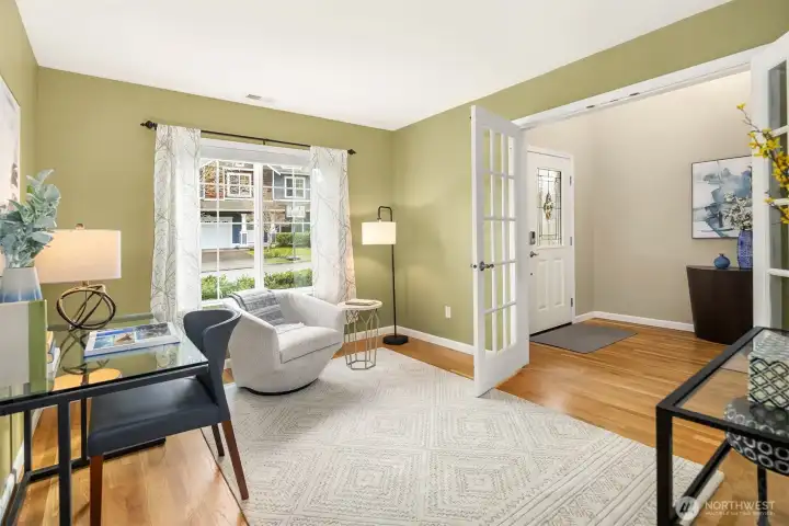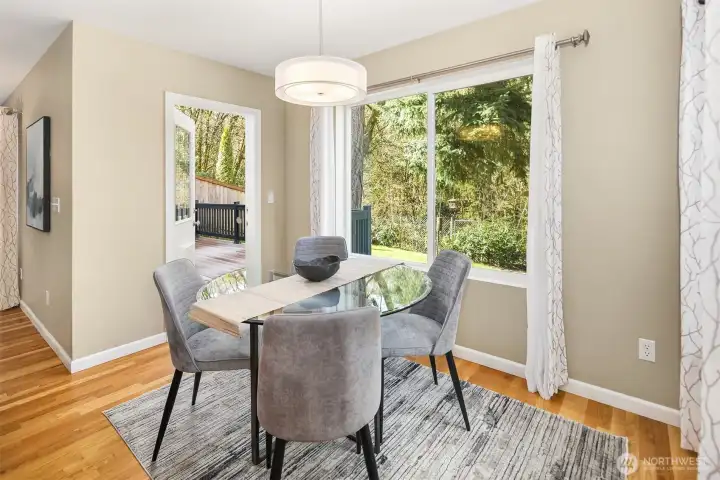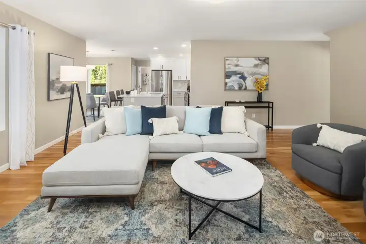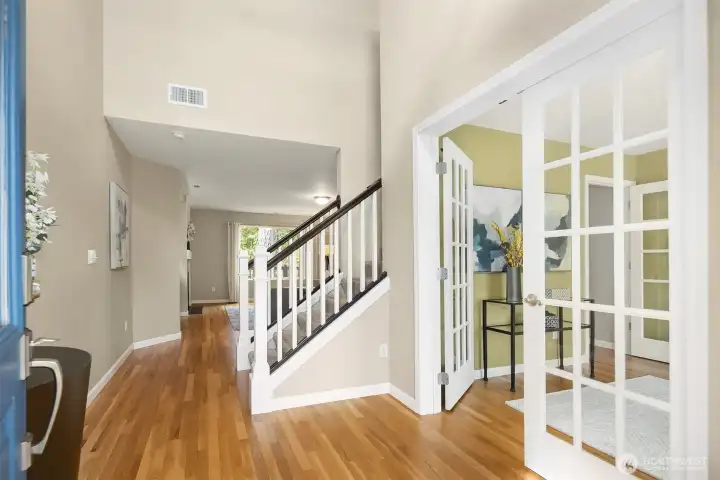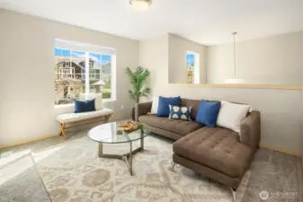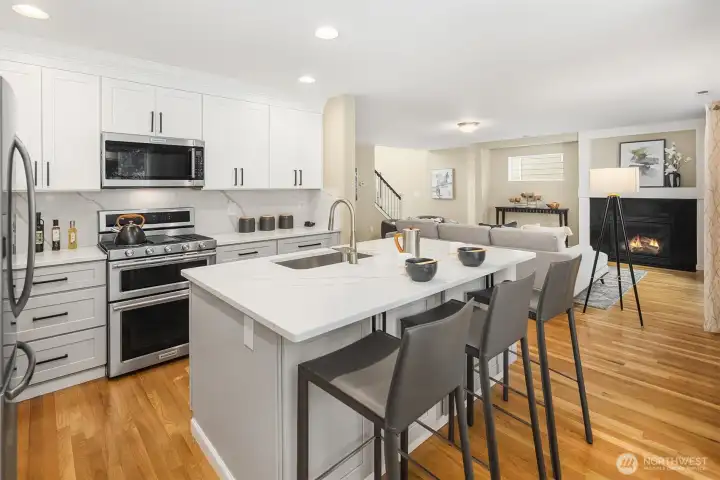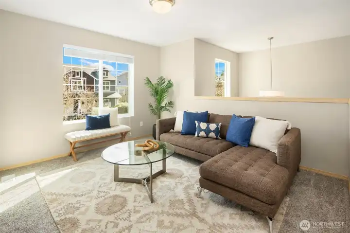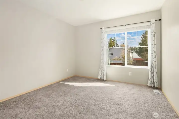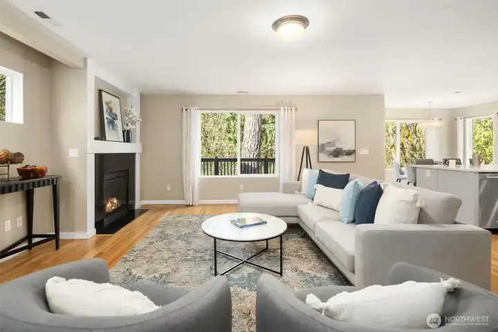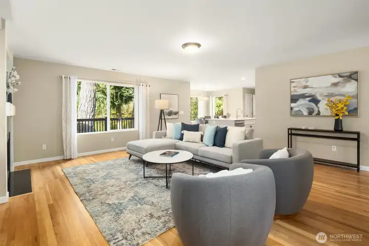 Welcome home to this beautifully maintained residence in sought-after Outlook Ridge, set on one of the community’s largest lots and backing to a private greenbelt with peaceful, natural views. This 3-bedroom home offers exceptional flexibility with a main floor office featuring French doors, plus an upstairs loft/bonus area that is ideal for work, play, or relaxation. Hardwood floors flow throughout the main level, leading to a stunning, updated kitchen with soft-close cabinetry, quartz countertops, stainless steel appliances, and a large island with bar seating plus a dining area - perfect for everyday living and entertaining. All bedrooms include walk-in closets, while the spacious primary suite impresses with a beautifully remodeled en suite bath featuring new cabinetry, quartz counters, dual sinks, tile flooring, and a luxurious shower and soaking tub.The east-facing orientation fills the home with natural light throughout the day. Additional highlights include a 2-car garage with hanging storage, expansive and easily accessible attic storage, and excellent overall condition. Fully fenced backyard includes newer composite deck, flagstone patio, and fire pit with built-in seating and complete privacy. You will love spending time outside, and value the peaceful views from inside too! Come enjoy a welcoming neighborhood with a community park and basketball court, highly ranked schools, and an ideal location close to shops, restaurants, parks, and trails.