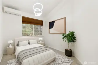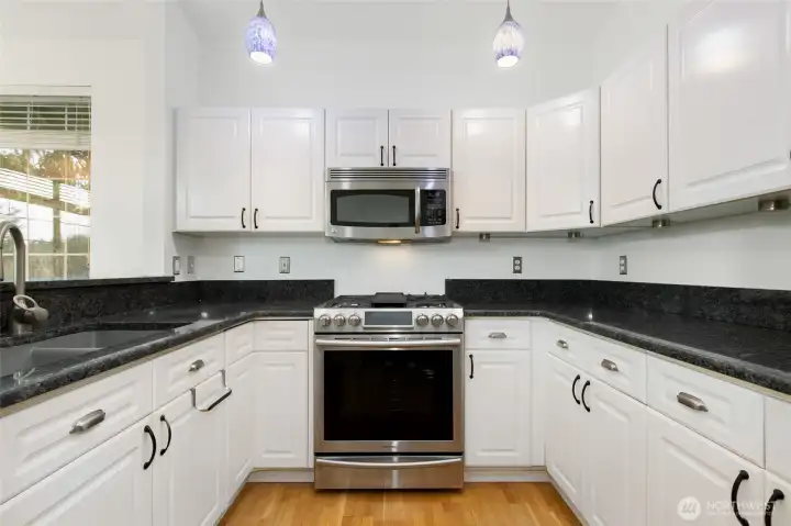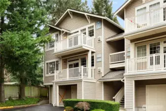 Home sweet home in this updated top-floor, private end-unit condo with a single-family feel. Vaulted ceilings and an evergreen-framed balcony bring natural light and a calm Northwest backdrop. The flexible two-bedroom + den layout is ideal for a home office—or easily use the den as a third bedroom for guests, hobbies, or a new arrival. Enjoy year-round comfort with three mini-splits for heating and A/C, plus a new electrical panel with whole-home surge protection and a transferable warranty. Cook with gas, relax by the gas fireplace, and appreciate smart-home conveniences when it's chilly outside. A rare bonus: your own private 1,100+ sq ft two-car tandem garage with EV charger. Enjoy tile baths, 3cm granite counters, and a marble-tile primary shower paired with upgraded designer fixtures and a new water heater for true move-in readiness. Great location near trails, shopping, and restaurants, and located within the award-winning Lake Washington School District.
