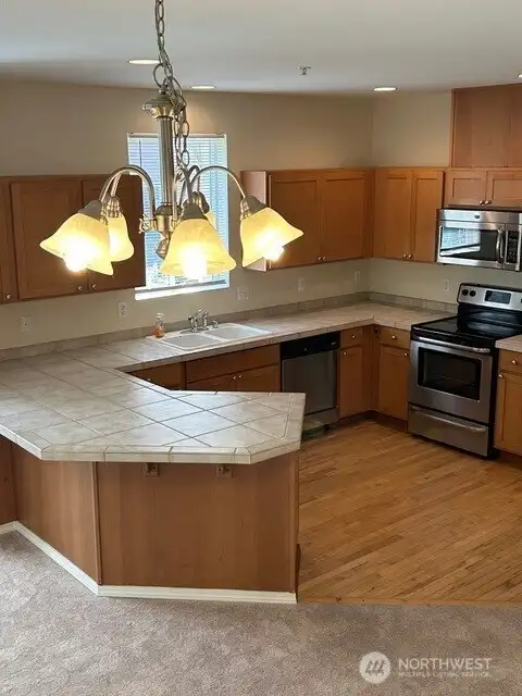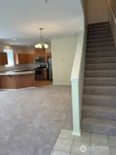 This open concept on main floor has new carpet & freshly painted! High ceilings & stainless appliances. Gas fireplace, two car garage, washer/dryer included. Full ensuite bath & walk-in closet.