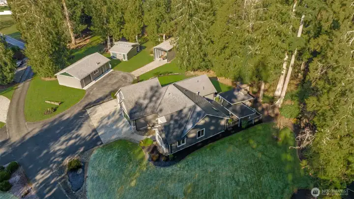 Rambler - Acreage - Shop + More! 2,400+ sq ft single-story living with a generous bonus room above the garage. Designed with an open-concept great room layout, this 4-bedroom, 2-bath home is filled with natural light from oversized windows and skylights, creating a warm and inviting atmosphere throughout. The updated kitchen features natural granite countertops and flows seamlessly into the main living area, highlighted by a stunning floor-to-ceiling stacked stone gas fireplace. Fresh interior paint and brand-new carpet make this home truly move-in ready. Step outside into the natural habitat and into nature of the sounding 6+ acres, with 2.5+ acres thoughtfully manicured. Entertain year-round under the expansive covered outdoor living area complete with its own fireplace and BBQ space — the perfect setting for gatherings or peaceful evenings at home. Need room for an RV, hobbies, storage, or projects? You’ll love the 16'x13'x35' Metal RV cover wired with 110, impressive heated 900 sq ft shop with custom cabinets, plus a 400 sq ft equipment shed with loft and many extras. This property offers space, privacy, and functionality - A rare combination of acreage, upgrades, and versatility — this one truly has it all and much more.