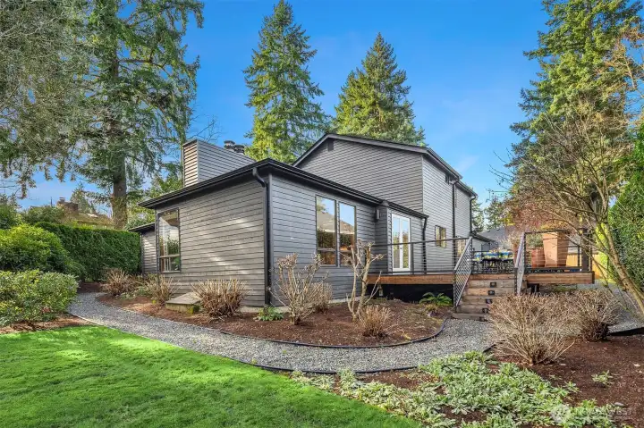 Positioned in a quiet enclave of three homes, this fully renovated NW contemporary home offers privacy and proximity. Thoughtful updates throughout include nutmeg-stained hardwoods, custom grain-matched cabinetry, slab quartz counters, and windows with garden views that create an ambience of quiet sophistication. Spaces are designed for connection: a vaulted living room with a gas fireplace, media-ready family room, and an epicurean kitchen that's as beautiful as it is functional. A generous island creates a space that naturally becomes the home’s gathering hub, whether for casual dining, extra work space, or visiting with the cook. Upstairs, the primary suite features a sitting area and spa-inspired bath, which is joined by two additional bedrooms with a shared hall bath. A main-floor guest room with Murphy bed and ¾-bath adds flexibility for visitors or office use. Outdoor living shines with an ironwood deck adorned with cable railing and a gas-plumbed fire pit, accessible from the kitchen and formal dining room, making it perfect for intimate gatherings or alfresco entertaining. A level, park-like side yard has limitless possibilities for recreation and gardening. Lush landscaping, mature hedging, and the private lane setting provide exceptional quiet, yet just minutes from Downtown Bellevue’s dining, shopping, parks, and convenient freeway access. A rare opportunity for turnkey contemporary living in an award-winning school district and an unbeatable in-city location.