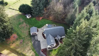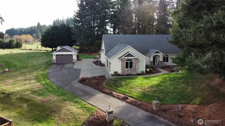 Peaceful Oasis tucked at end of a cul-de-sac, this exquisite 3,354 SF custom home rests on 2.5 park-like acres, offering a rare blend of privacy, elegance, and everyday comfort. Outdoor entertainment supreme with extensive patio coverage, picturesque drive, heated 2-car detached garage duos as a shop, garden shed, gazebo, manicured landscaping, and charming covered entry create a lasting first impression. Enjoy 2.5 acres of lush grounds ideal for relaxing, gardening, or outdoor gatherings, with space to unwind, explore, add and ADU with no HOA restrictions, and entertain. Whether hosting guests or savoring quiet moments, this home supports a lifestyle of comfort and connection. Perfectly positioned for those seeking seclusion without sacrificing convenience, this exceptional residence offers refined comfort, timeless design, and a peaceful retreat ready to welcome you home. Step inside to a whole house generator, soaring 20+ foot ceilings and sun-filled spaces set the stage for gracious living and effortless entertaining. The main level features a welcoming front parlor, expansive great room, and a luxurious primary retreat with a spa-inspired five-piece bath, jetted soaking tub, and walk-in closet. Two additional bedrooms share a Jack & Jill bath, while a versatile den or office easily adapts as a guest suite or creative space. Thoughtfully designed to balance openness and privacy, large windows frame tranquil natural views throughout, filling the home with warmth and light.