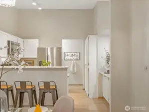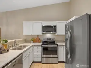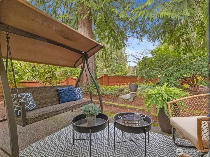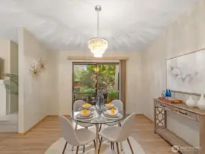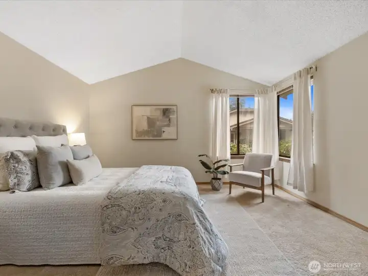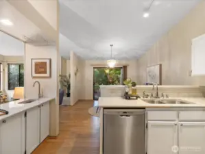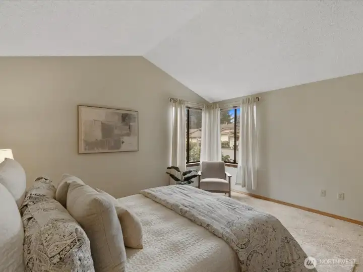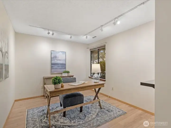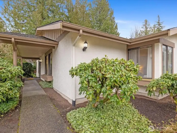 Light-filled, one-level 1,276 sq ft condo in the desirable Mill Creek Country Club, ideally situated as a corner unit with a private, wooded outlook. This spacious 2 bedroom plus office, 1.75 bath home offers a functional and flexible layout with beautiful laminate flooring throughout the main living areas and primary bath. Terrific open concept with vaulted ceilings, living room features brick surround cozy gas fireplace and wet-bar that extends kitchen counter area. All of which creates an inviting atmosphere for everyday living or entertaining. The kitchen is offers granite countertops and updated stainless steel appliances, some interior areas have been freshly painted making this move-in-ready. The primary suite XL and has a beautifully updated en-suite 3/4 bath with an oversized tiled shower and dual-sink quartz vanity. Guest bath features an updated vanity and tile flooring. Enjoy peaceful mornings or evenings on the private patio overlooking mature trees that is accessible from dining area. Attached garage allows for no-stair access into home. Additional 1-car driveway parking and ample guest parking nearby. Well-managed community, very health HOA with no special assessments. Roof and aggregate driveways have been recently replaced. Enjoy access to community walking trails, sports courts and parks. Conveniently located minutes to shopping/dining and with easy access to I-405, I-5, and community transit.