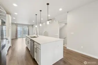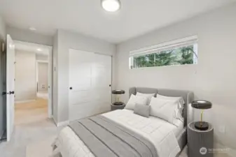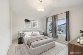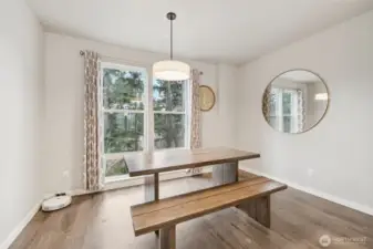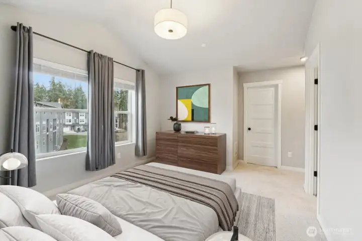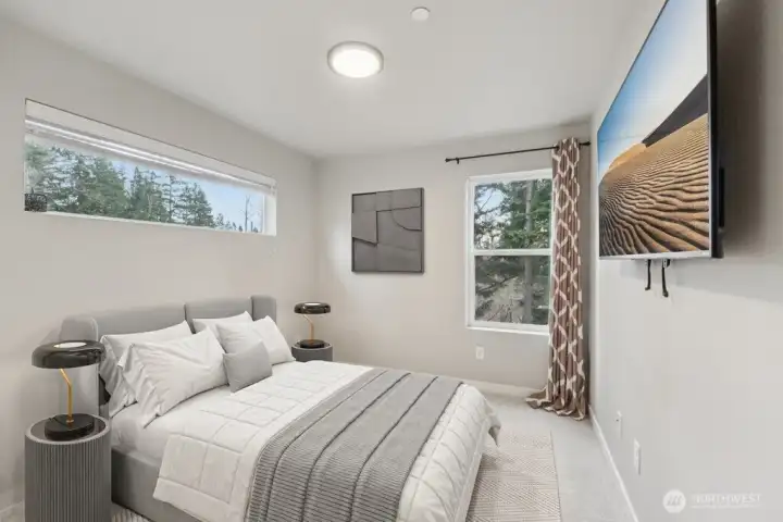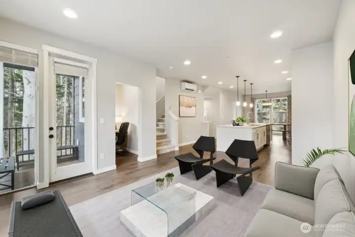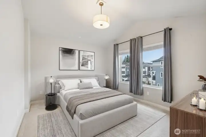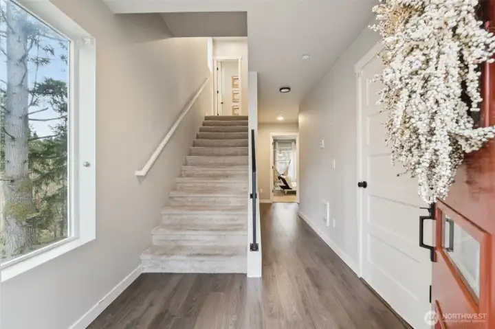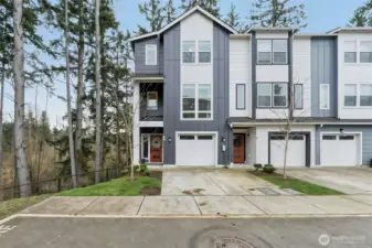 Welcome to Ladera! Built in 2021, this desirable end-unit townhome offers privacy and tranquility, backing to a protected greenbelt at the edge of the community. The 2,061 sq ft Allyn plan features 4 bedrooms, 3 bathrooms, and a 1-car garage, combining modern design with functional living. Premium interior finishes include laminate hardwood flooring, white millwork and doors, contemporary iron railings, and quartz countertops. The lower level features a private bedroom with an attached bathroom—ideal for guests, a home office, or multigenerational living. The main level showcases a spacious open-concept layout connecting the kitchen, dining nook, and great room, with access to a private deck overlooking the greenbelt. Upstairs, the primary suite offers a walk-in closet and a beautifully tiled shower with a dual showerhead system, along with two additional bedrooms, a full bath, and convenient laundry. Centrally located in Lynnwood with easy access to highways, shopping, dining, and amenities. Extremely energy-efficient with low-maintenance living, modern safety features, and EV-charging-ready garage—designed for today’s lifestyle!
