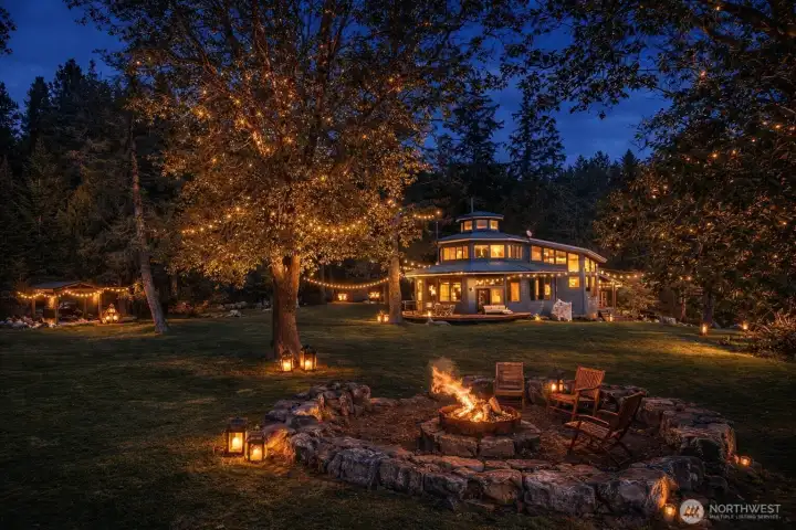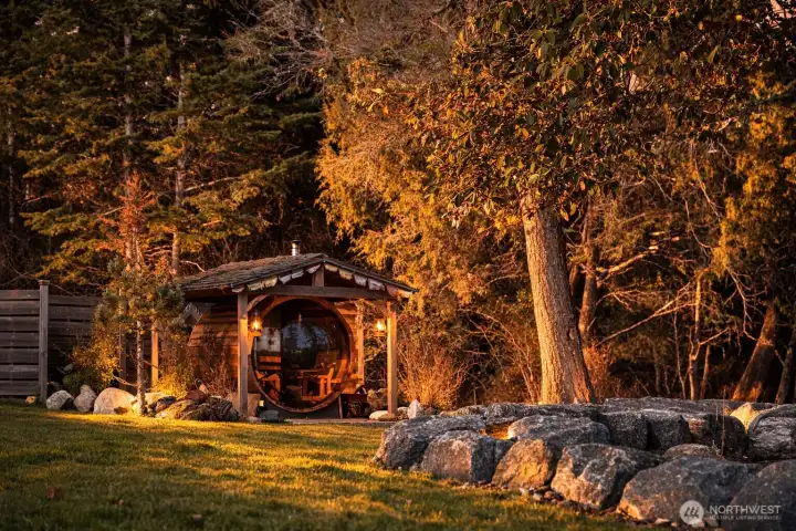 Welcome to Yacht Haven Road. Set across seven private acres overlooking the Haro Strait, this exceptional property offers peekaboo water views framed by old-growth Madrona trees and open pastureland, creating a landscape that feels both expansive and intimate. The sun-filled, south-facing residence is thoughtfully sited to capture natural light throughout the day. Wrapped in cedar siding with a standing-seam metal roof, the home blends enduring craftsmanship with timeless island character. Inside, the main level features soaring 12-foot ceilings, exposed beams, and an airy open-concept living space. The second-floor primary suite includes a walk-through closet, sitting area, and private bath, while the third-floor cupola provides a quiet retreat above it all. A separate guest cabin with fireplace offers flexibility for guests, a studio, or workspace.
