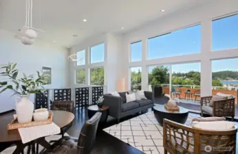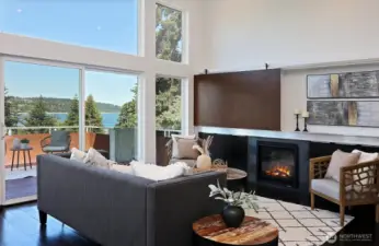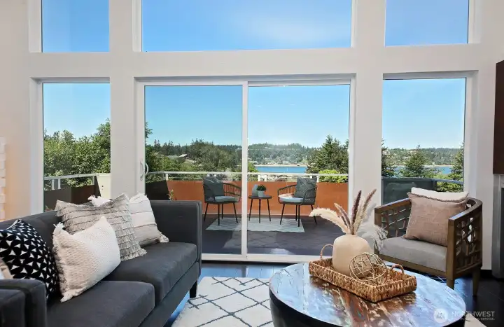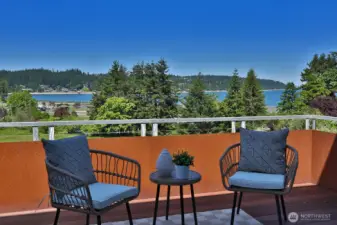 Move in ready home with sweeping territorial views overlooking Freeland, Sound views of Holmes Harbor & Freeland Beach Park. Highlights include: fresh interior paint throughout, new ultra quiet high efficiency heat pump providing heat and cooling all year long as well as a new high efficiency furnace as an additional heat source, recent home maintenance chores completed, landscape trimmed and tidy...truly a space to unpack and enjoy. Nearly 3000 sqft of light-filled living space with vaulted ceilings, expansive great room and large balcony ideal for entertaining or relaxing! Main level primary suite plus two bedrooms. Bright lower level offers spacious rooms including a studio, den and theater room-work out space-office also plumbed for kitchenette! Perfect for guests, work, play or multi-generational living. Enjoy sunsets, starry skies, garden space, fruit trees and two car garage. Low maintenance metal roof and composite decking keeps things simple. Bonus points for close proximity to shops, services, medical & conveniences...drive less and walk more!